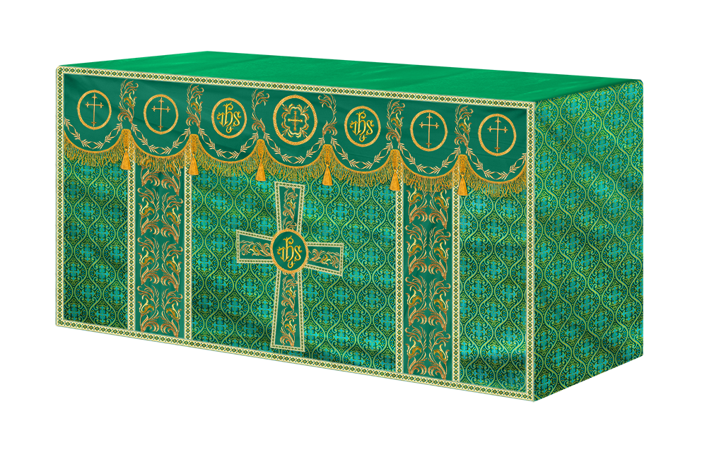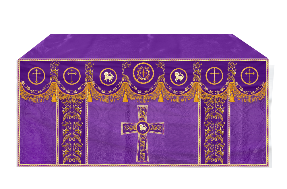 Enhance your worship space with the Embroidered Altar Cloth with Liturgical Motif, exquisitely handcrafted from premium fabric options, including damask, brocade, ogee, or folium. Each cloth features a beautifully embroidered spiritual motif, elegant trims, and refined tasselsβ€”symbolizing reverence and devotion in every detail.