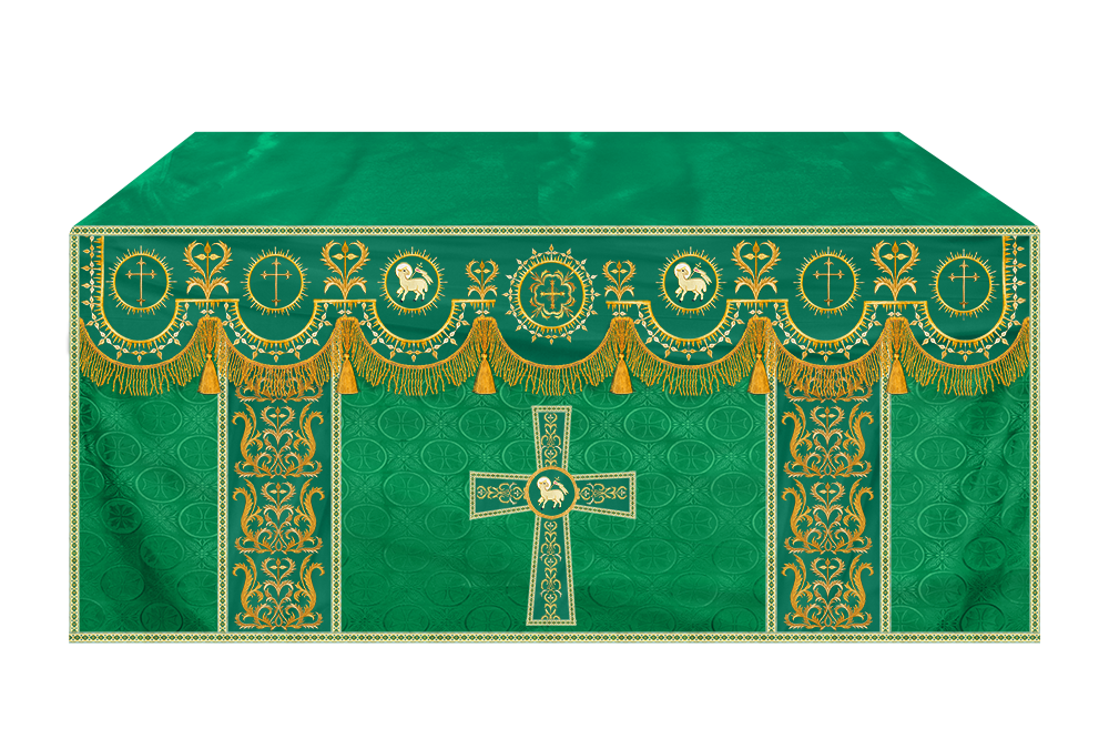 Meticulously handcrafted from premium-quality damask, this Embroidered Altar Cloth exudes elegance and durability. The soft, luxurious fabric is available in all standard liturgical colors to complement any worship space. A fully interlined satin drop adds structure and a graceful drape, enhancing the altarβs beauty and reverence