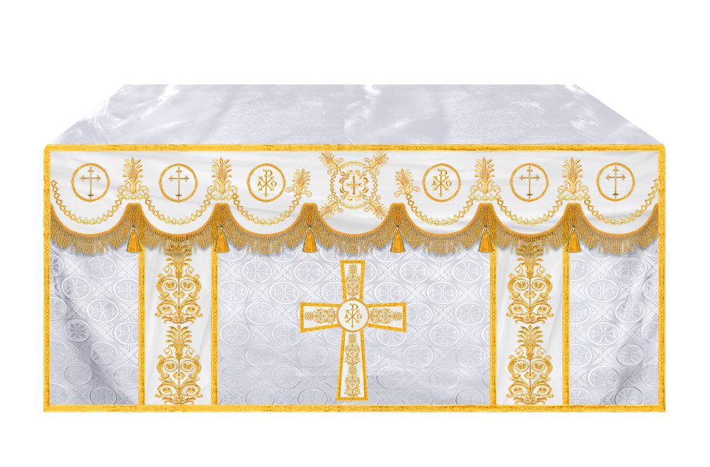 The Liturgical Altar Cloth with Elegant Embroidery Trims blends craftsmanship, luxury, and spiritual significance.Β Its intricate embroidery and refined trims create a dignified centerpiece. The structured satin drop adds elegance to any sanctuary.Β Ideal for congregations that value quality, heritage, and reverence.Β This altar cloth enhances every liturgical celebration.Β It remains a treasured part of your church’s sacred seasons.