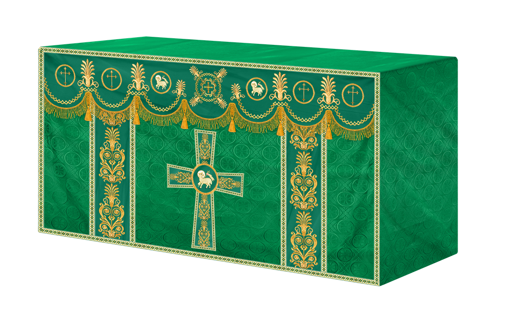Meticulously handcrafted from premium-quality damask, this Traditional Altar Cloth exudes elegance and durability. The soft, luxurious fabric is available in all standard liturgical colors to complement any worship space. A fully interlined satin drop adds structure and a graceful drape, enhancing the altarβs beauty and reverence