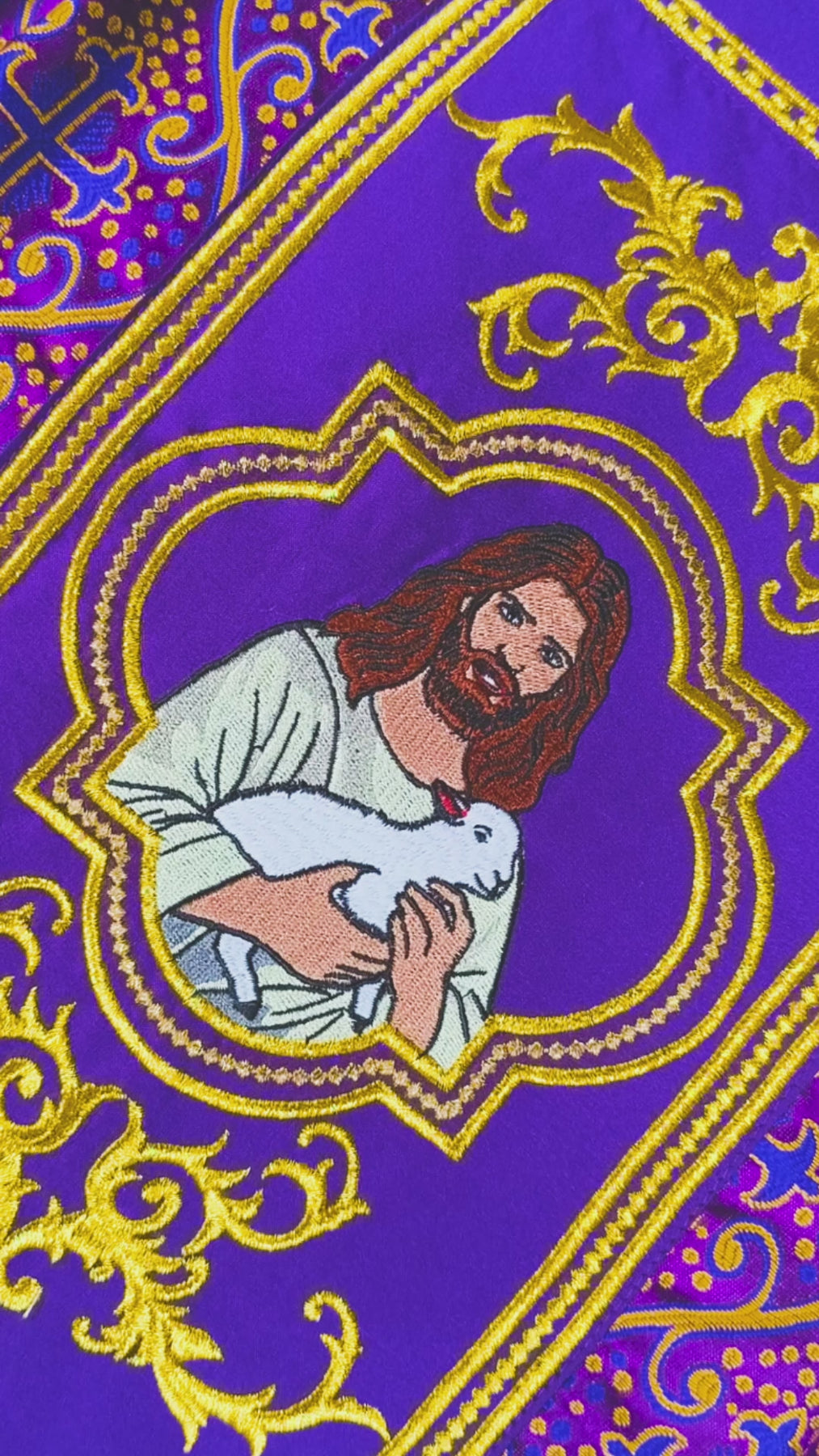 • The central orphrey panel features masterful gold embroidery of Jesus holding the Lamb, symbolizing divine mercy and guidance.