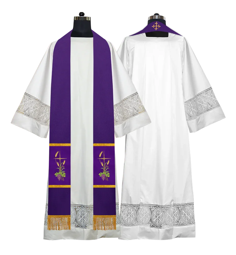 Embrace liturgical elegance with our Clergy Stole embroidered with Wheat and Grapes, crafted for discerning clergy members. This priest stole is expertly crafted for beauty and spiritual significance, making it essential for any minister’s ceremonial attire.