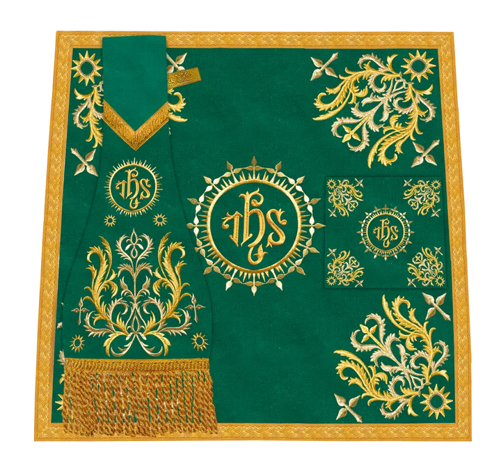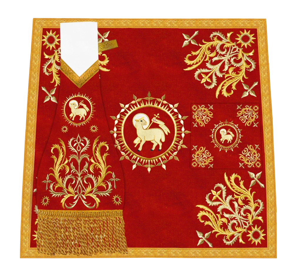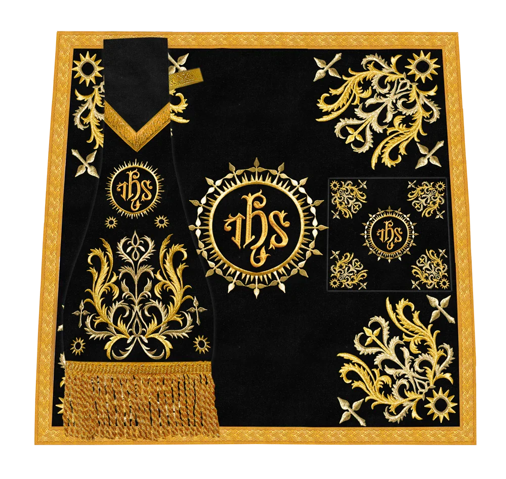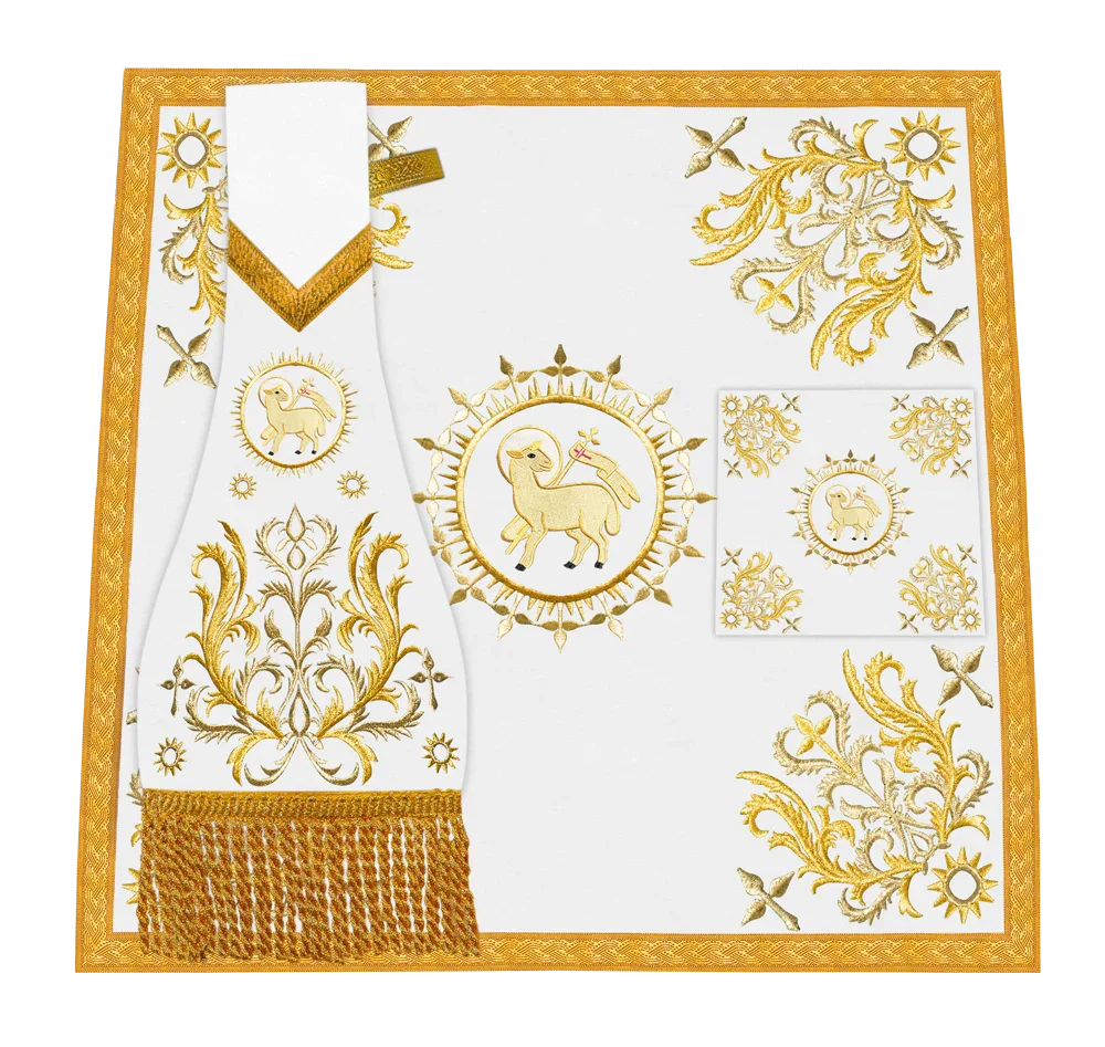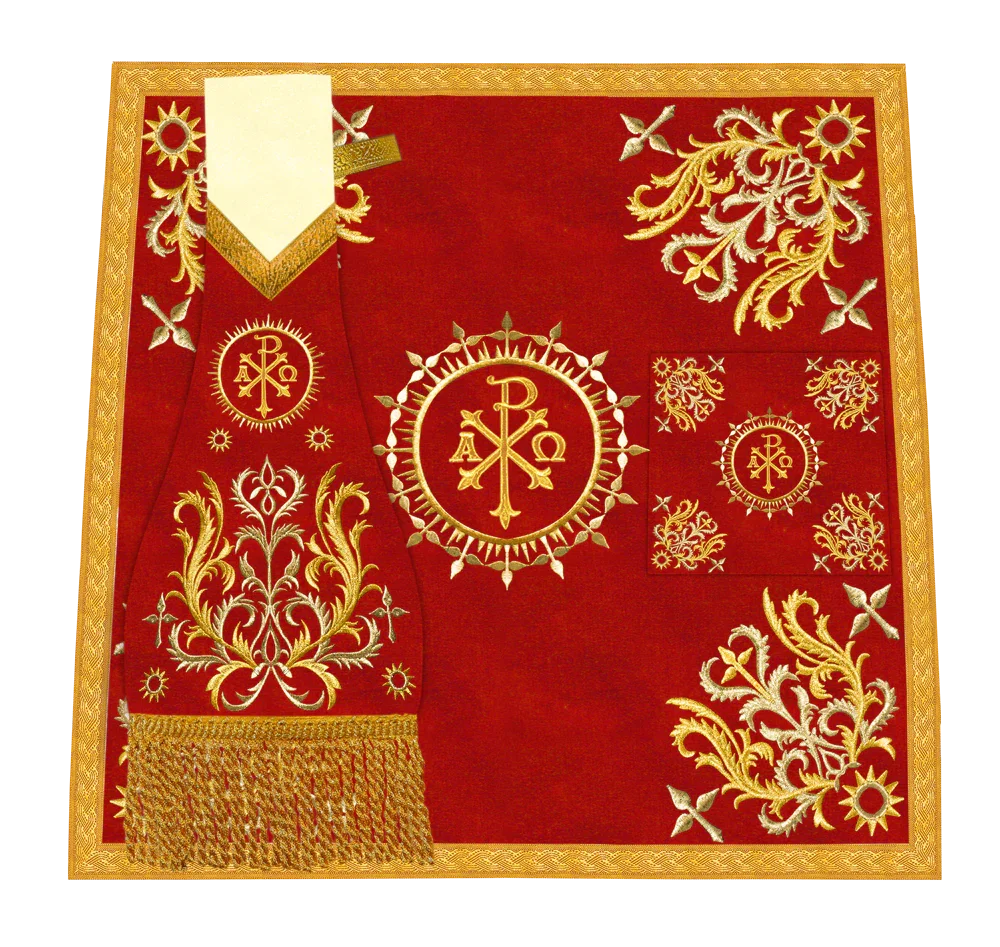 Elevate every celebration of the Eucharist with the Embroidered Mass Set. It is meticulously crafted for clergy who value reverence, tradition, and exceptional craftsmanship. Made from premium Taffeta fabric, each piece offers a luxurious texture and subtle sheen. The set provides enduring quality and enhances the solemnity of every liturgical ceremony.