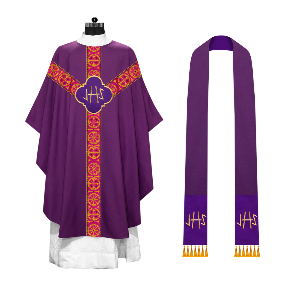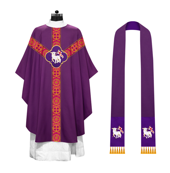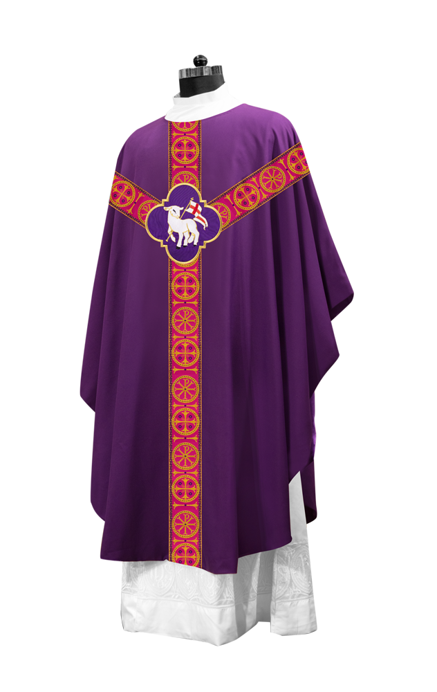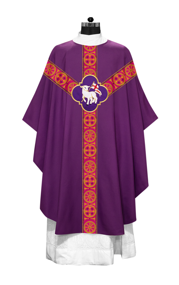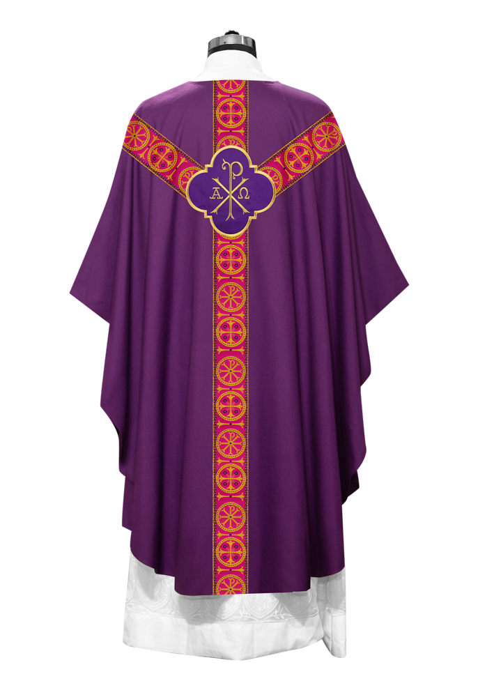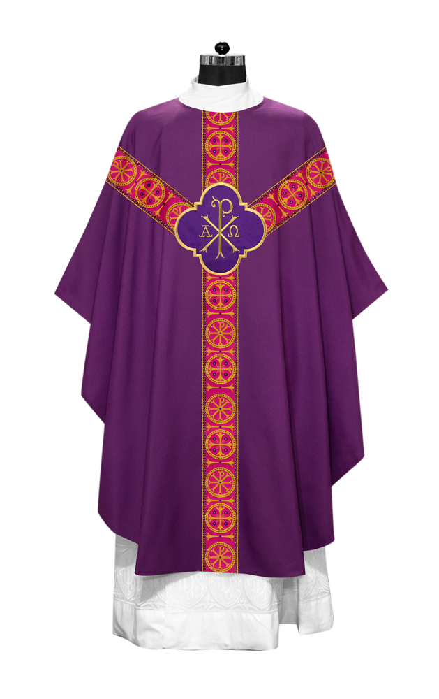 Elevate every sacred ceremony with this Liturgical Gothic Chasuble, featuring an ornate designer orphrey and crafted with expert workmanship.