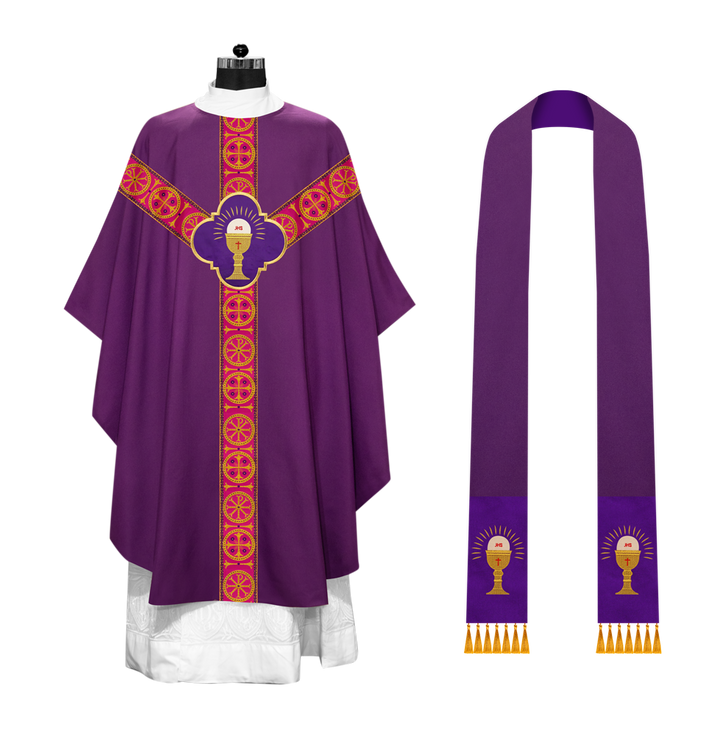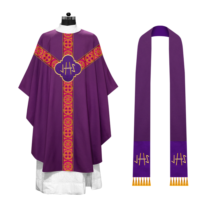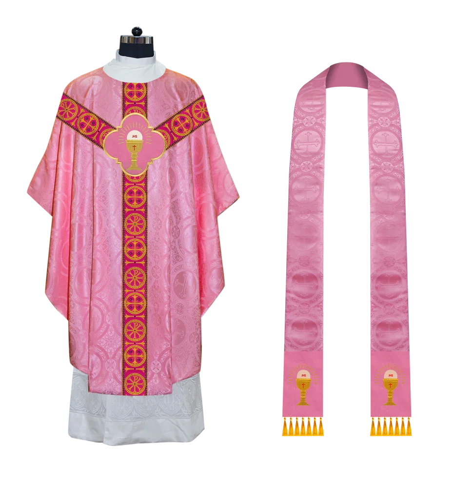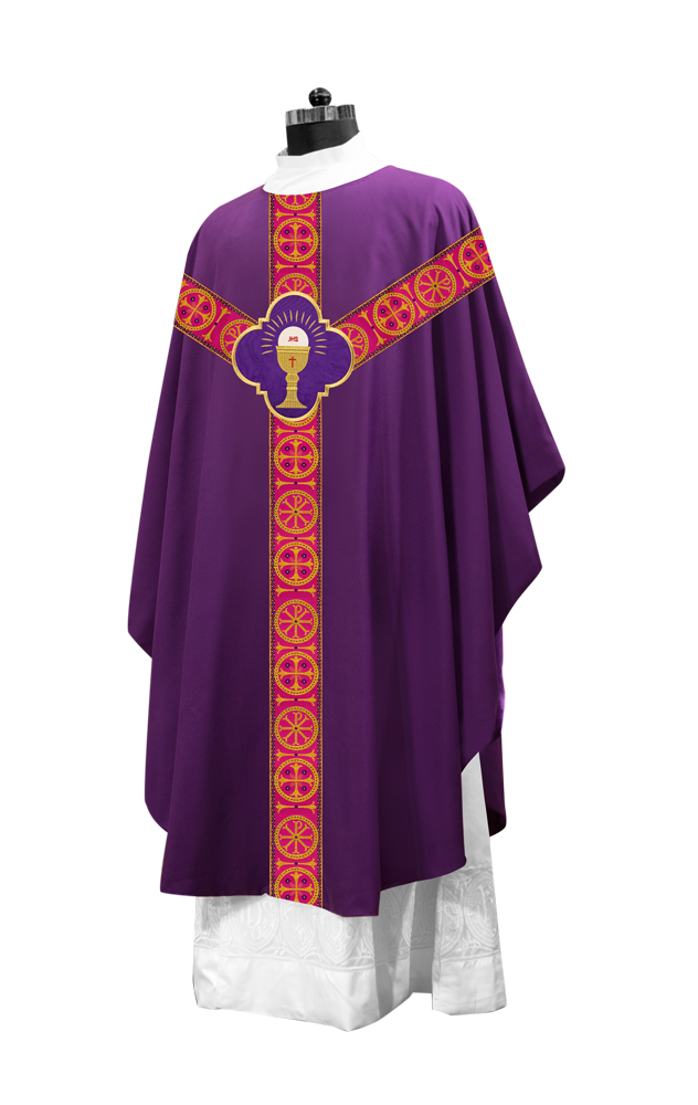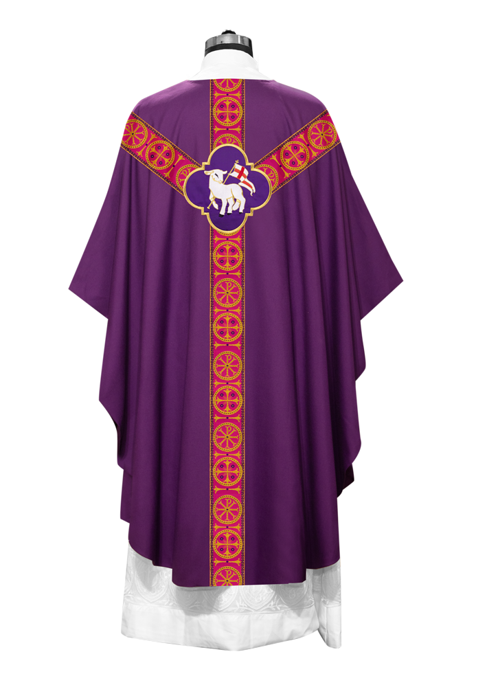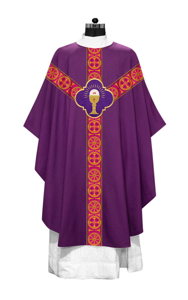 Elevate every sacred ceremony with this Liturgical Gothic Chasuble, featuring an ornate designer orphrey and crafted with expert workmanship.