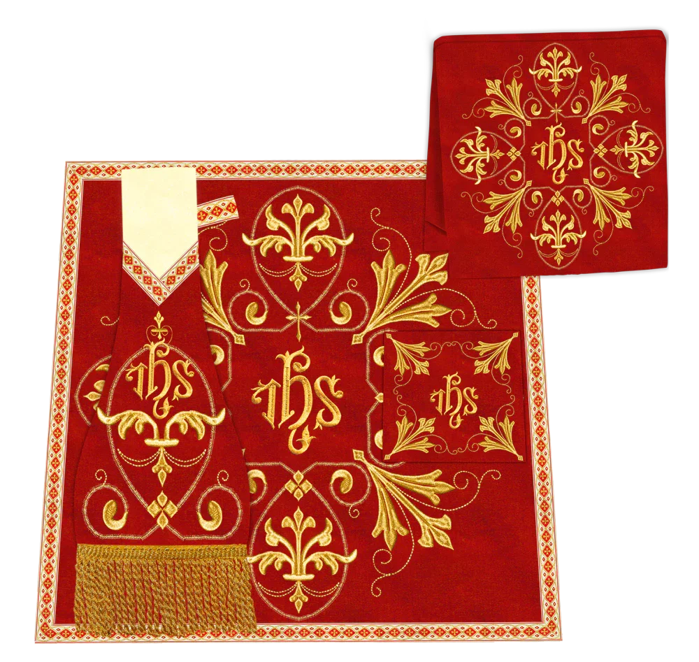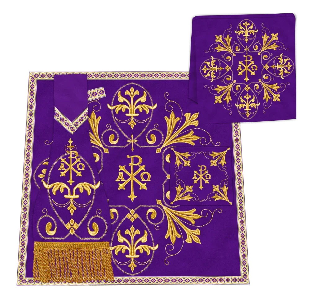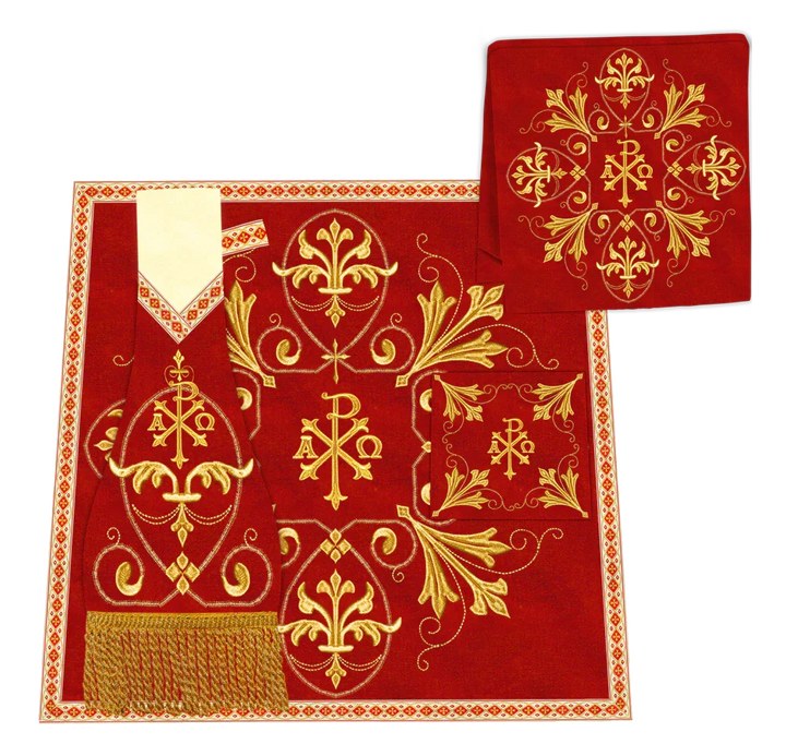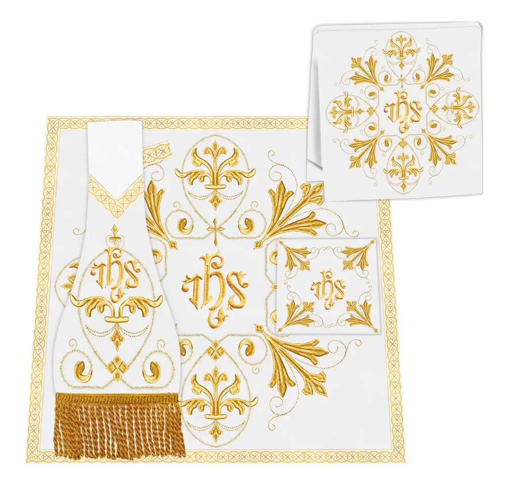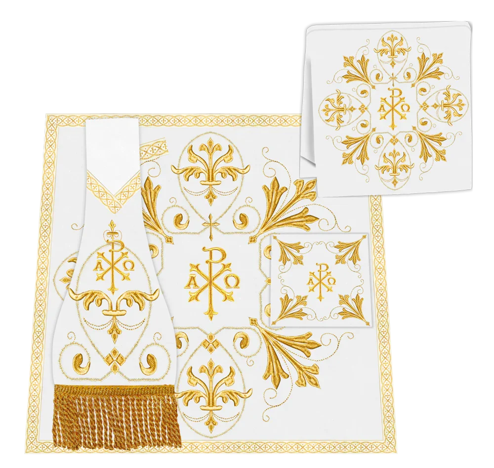 • Optional Matching Mass Set ($42): Includes Chalice Veil (20" x 20"), Burse (10" x 9"), Maniple(19"), and Chalice Pall (8" x 8") for a complete ceremonial set.