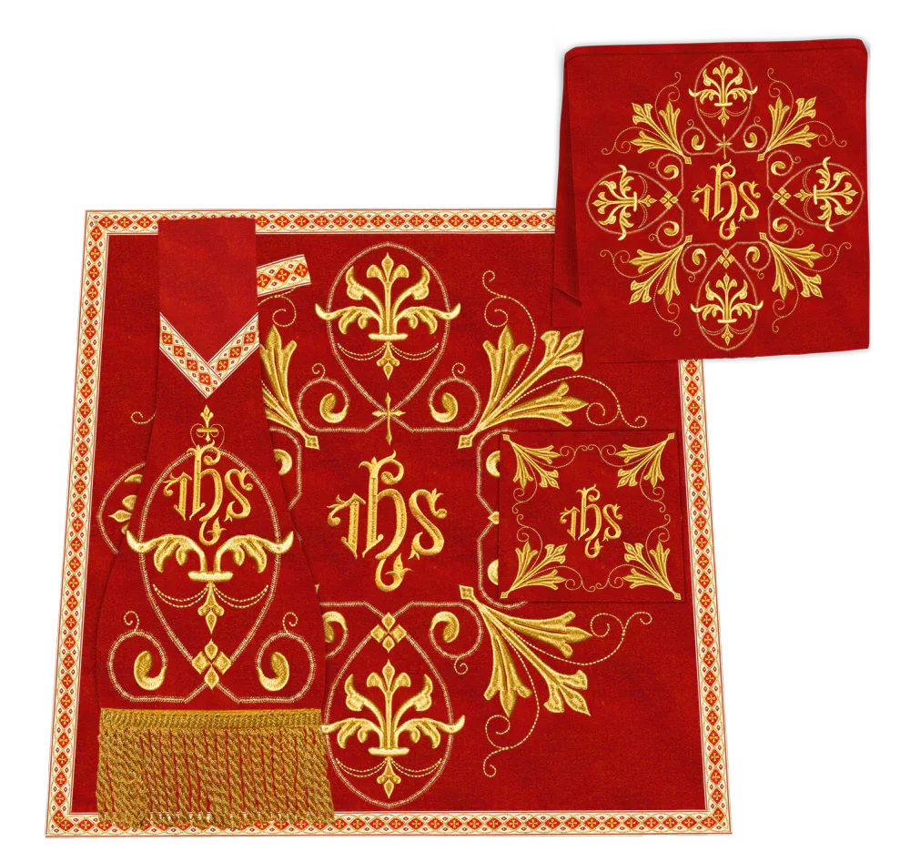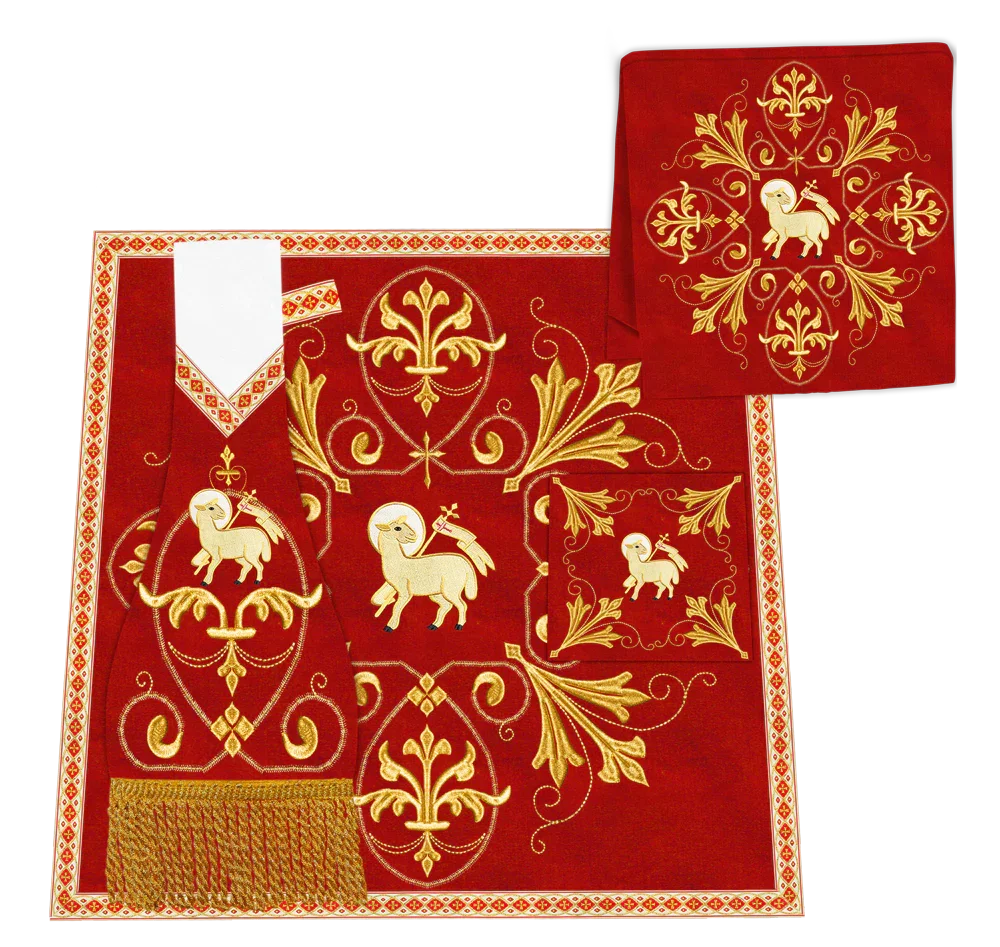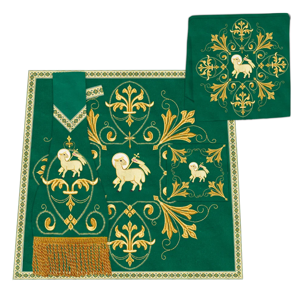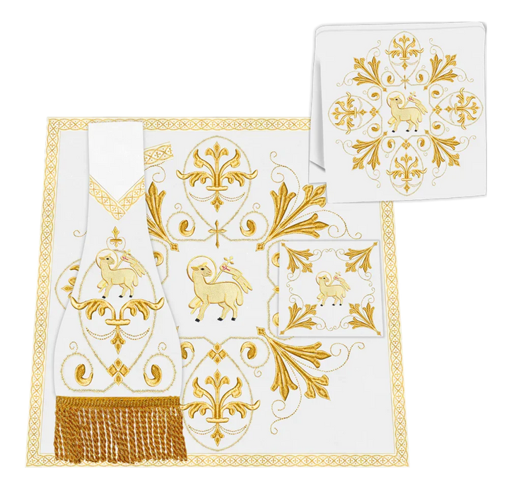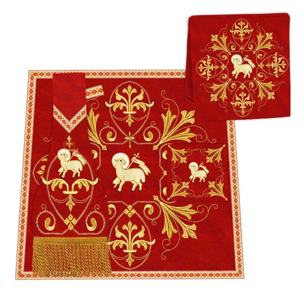 • Optional Matching Mass Set ($42): Includes Chalice Veil (20" x 20"), Burse (10" x 9"), Maniple(19"), and Chalice Pall (8" x 8") for a complete ceremonial set.
