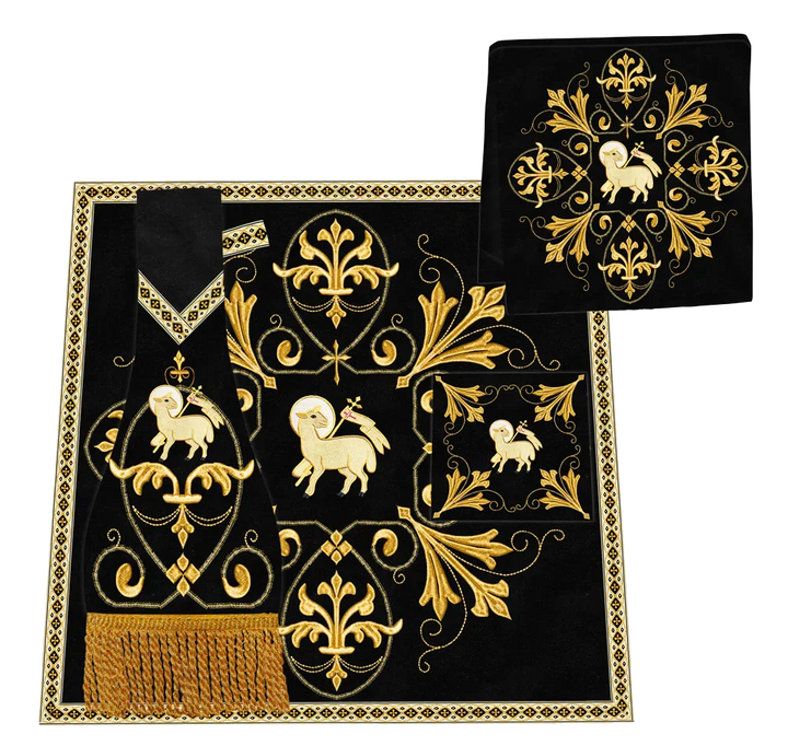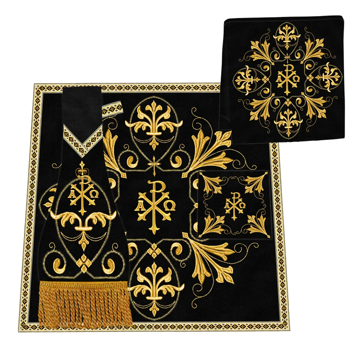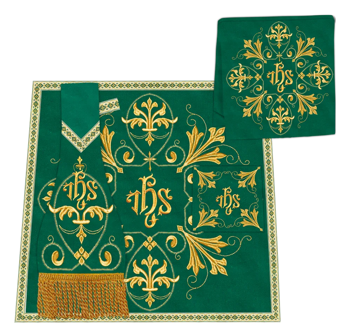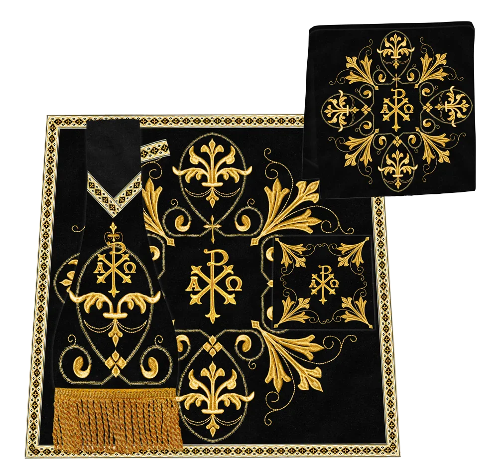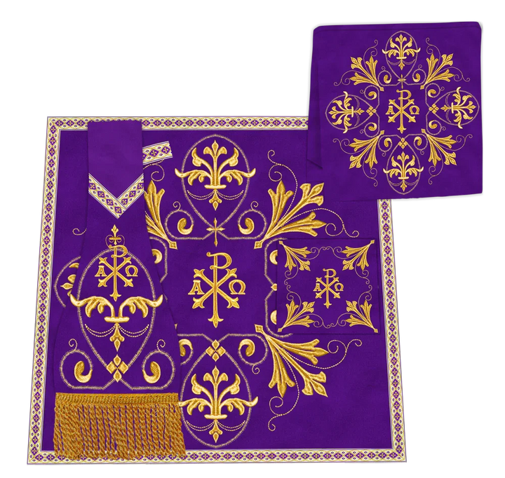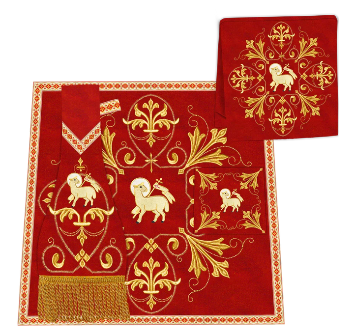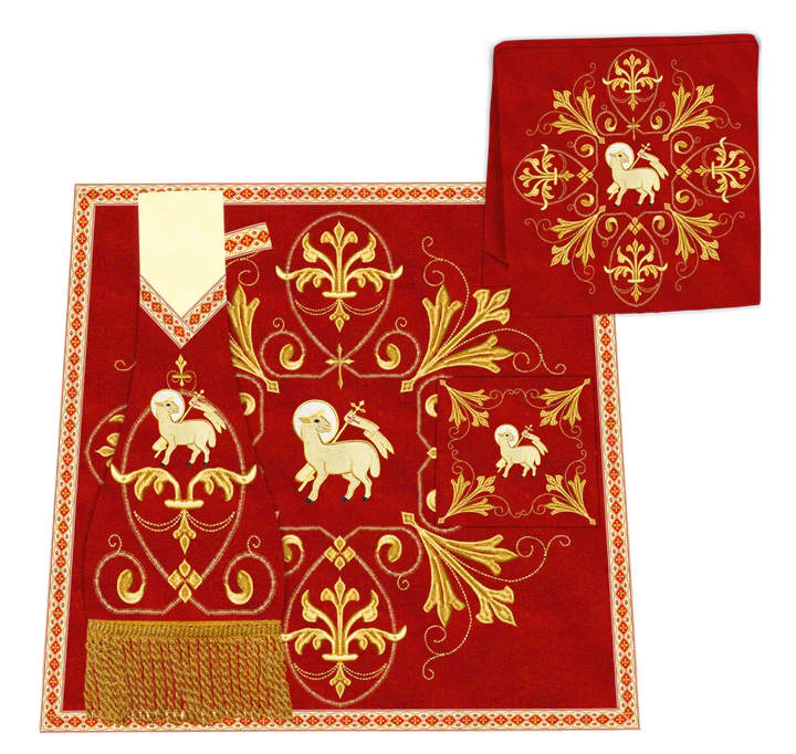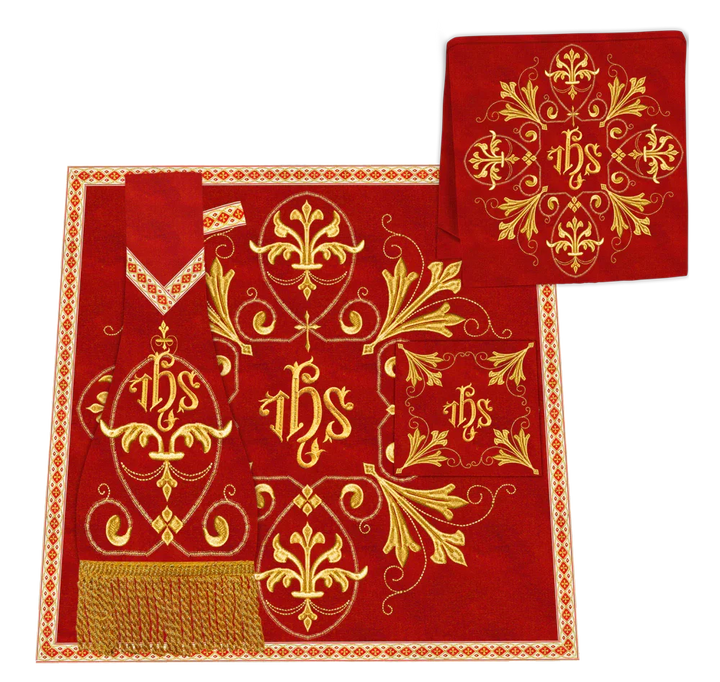 • Optional Matching Mass Set ($42): Includes Chalice Veil (20" x 20"), Burse (10" x 9"), Maniple(19"), and Chalice Pall (8" x 8") for a complete ceremonial set.
