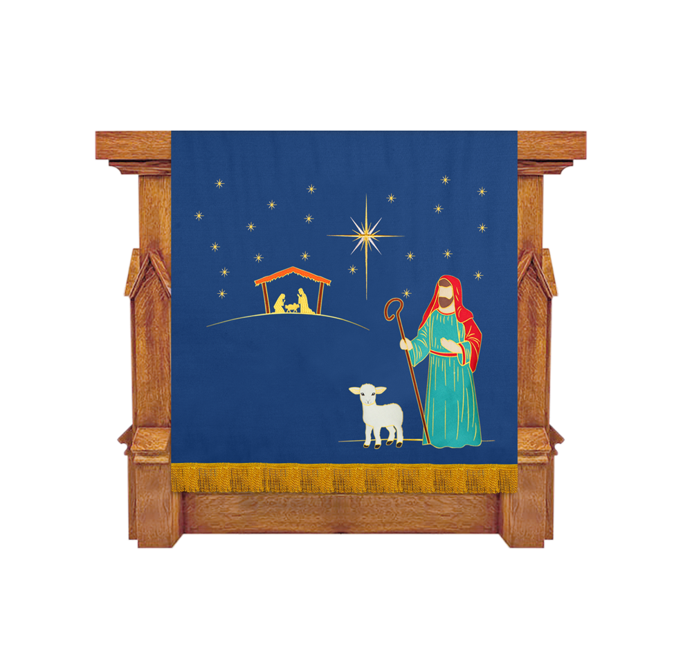Adorne su altar con este antependio bellamente bordado, que muestra una serena escena de la Natividad complementada con imágenes de ovejas y un pastor. Este antependio está elaborado con tela de poliéster de primera calidad y presenta un bordado detallado.
