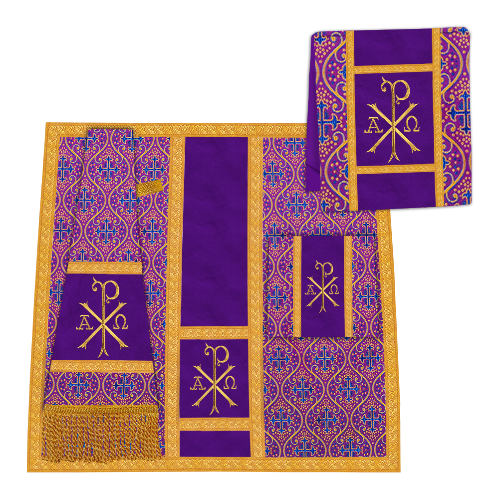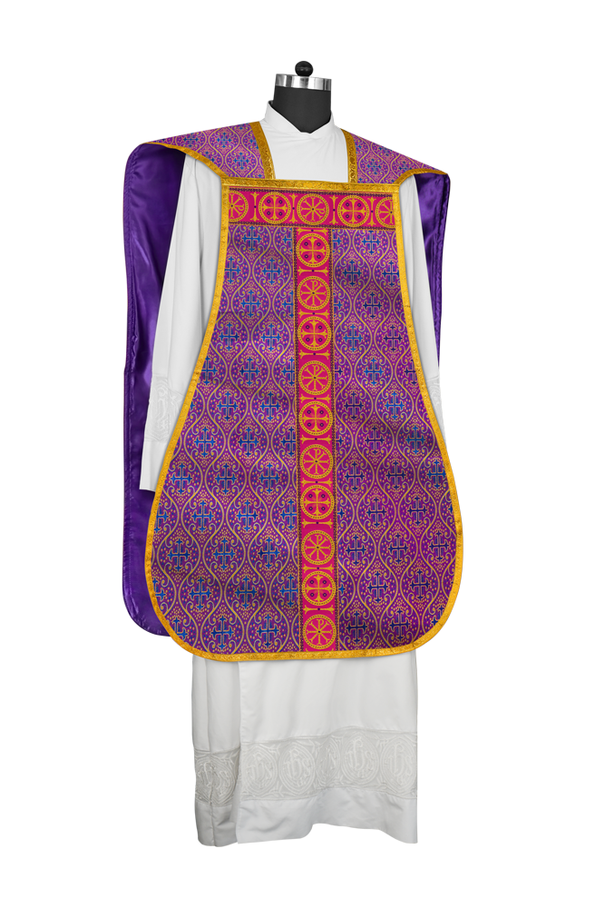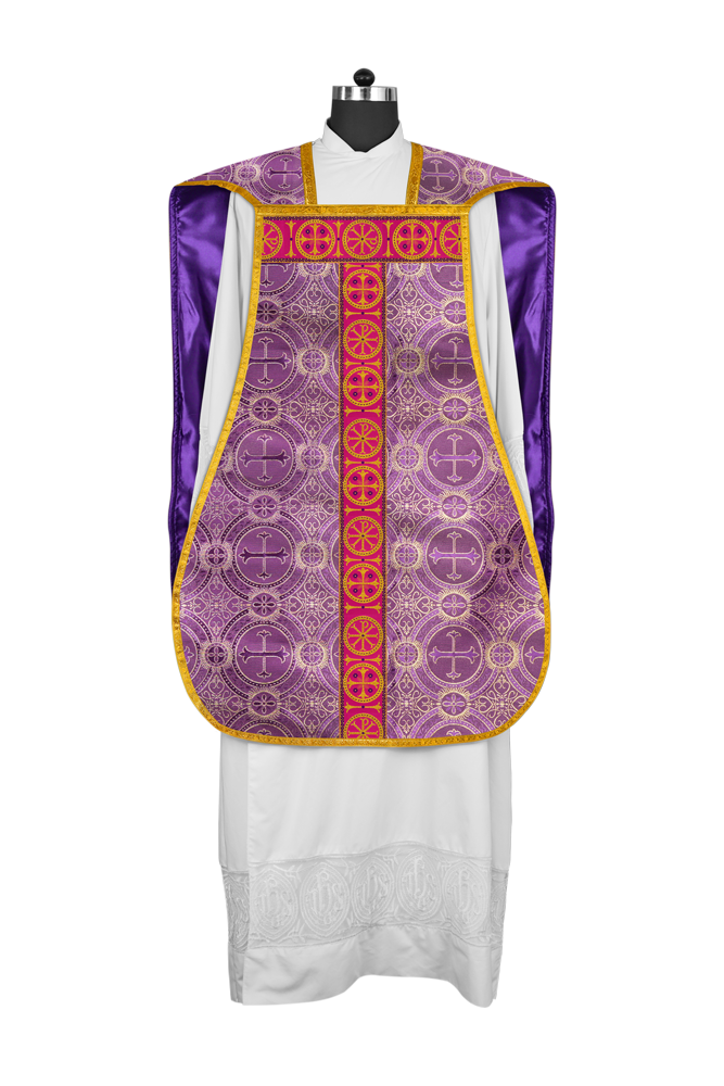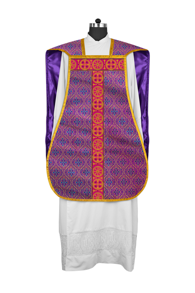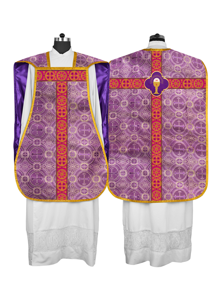 • La vestidura de casulla romana con espalda de violín está adornada con un motivo bordado.