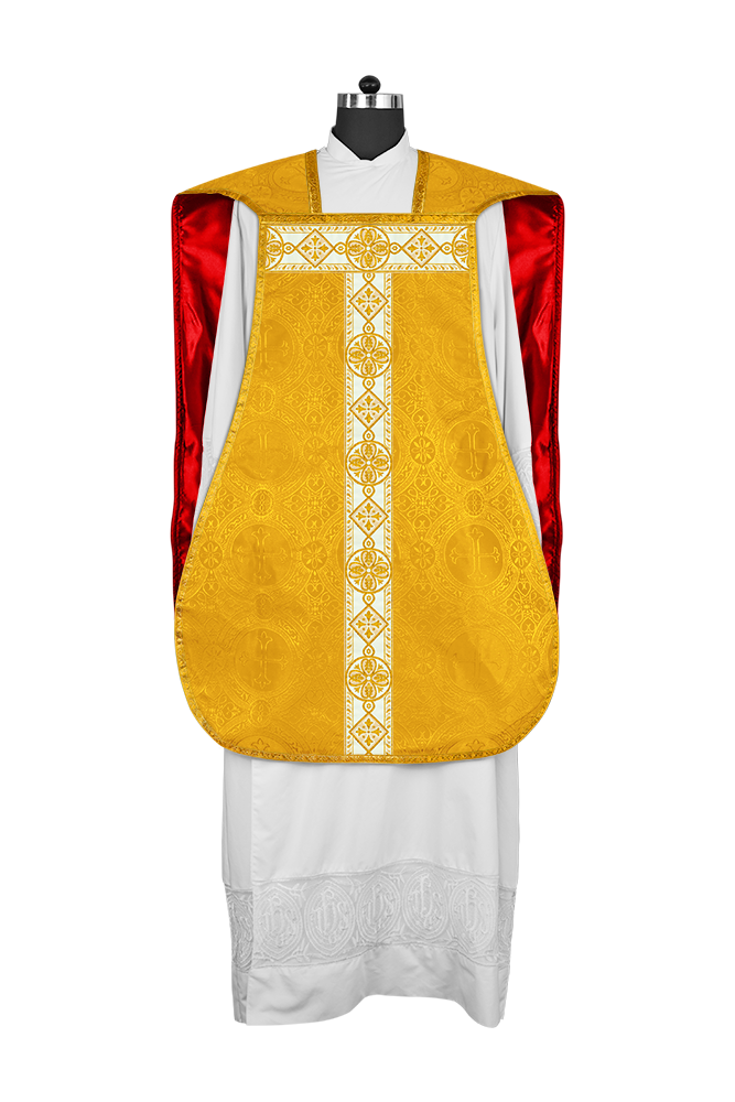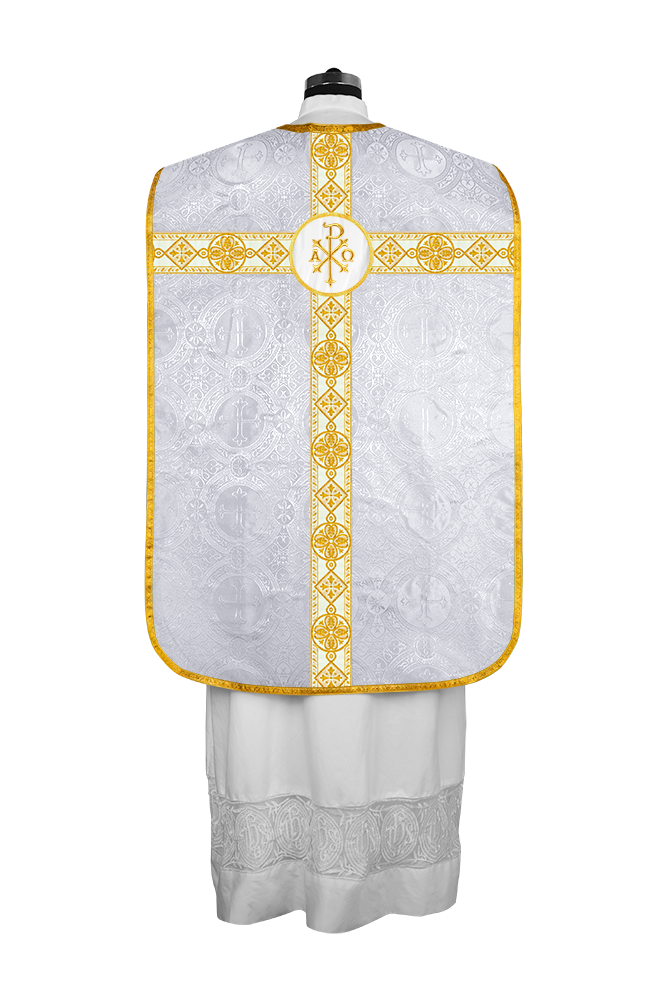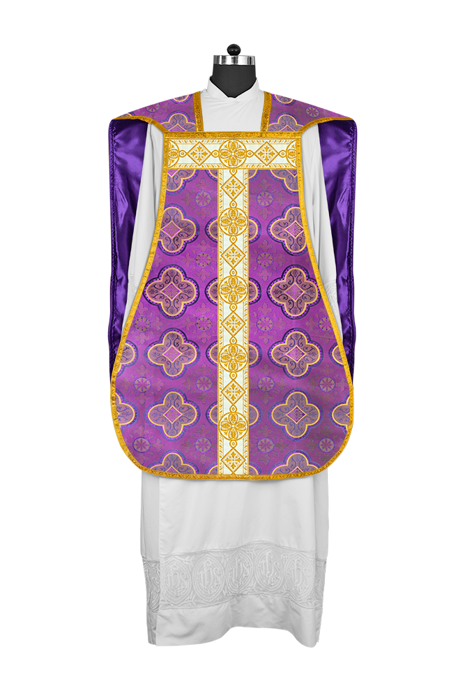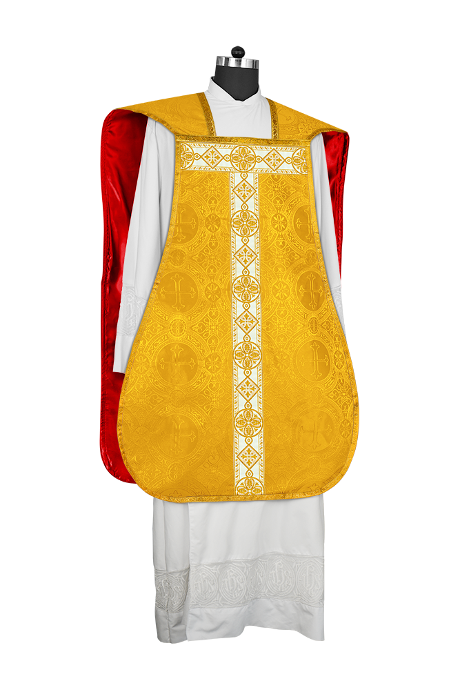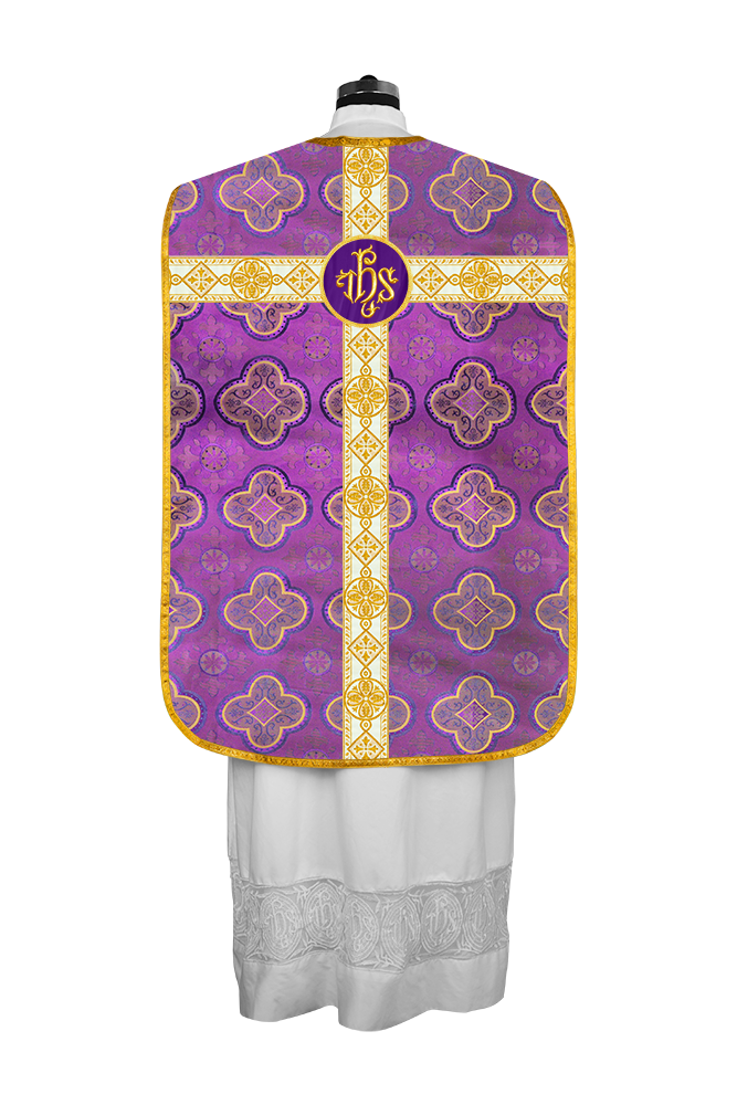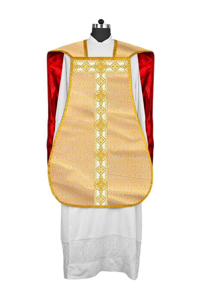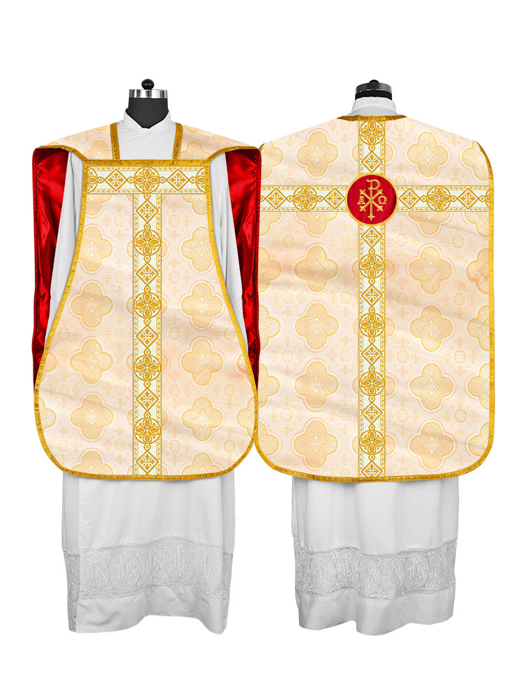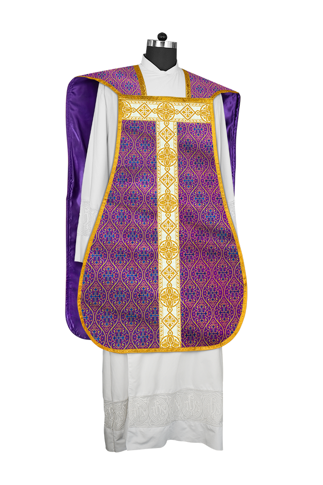• La vestimenta de casulla romana / con respaldo de violín está hecha de orfebrería con motivos y diseños de bordados ornamentados.