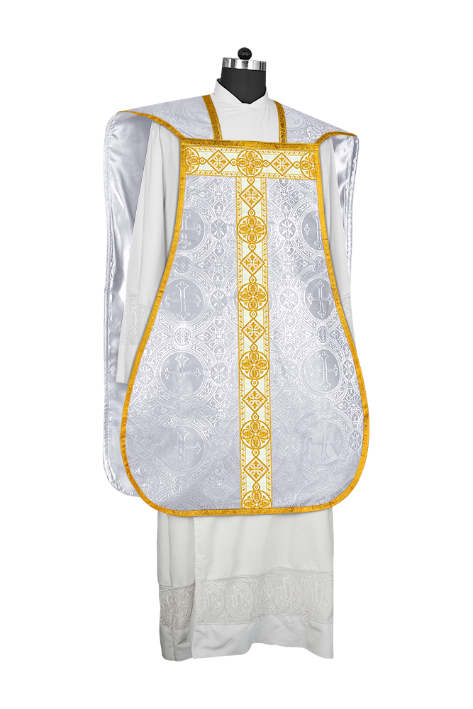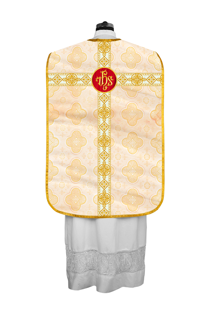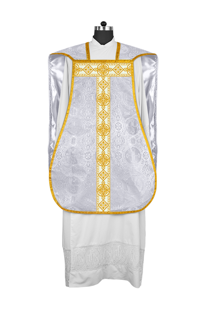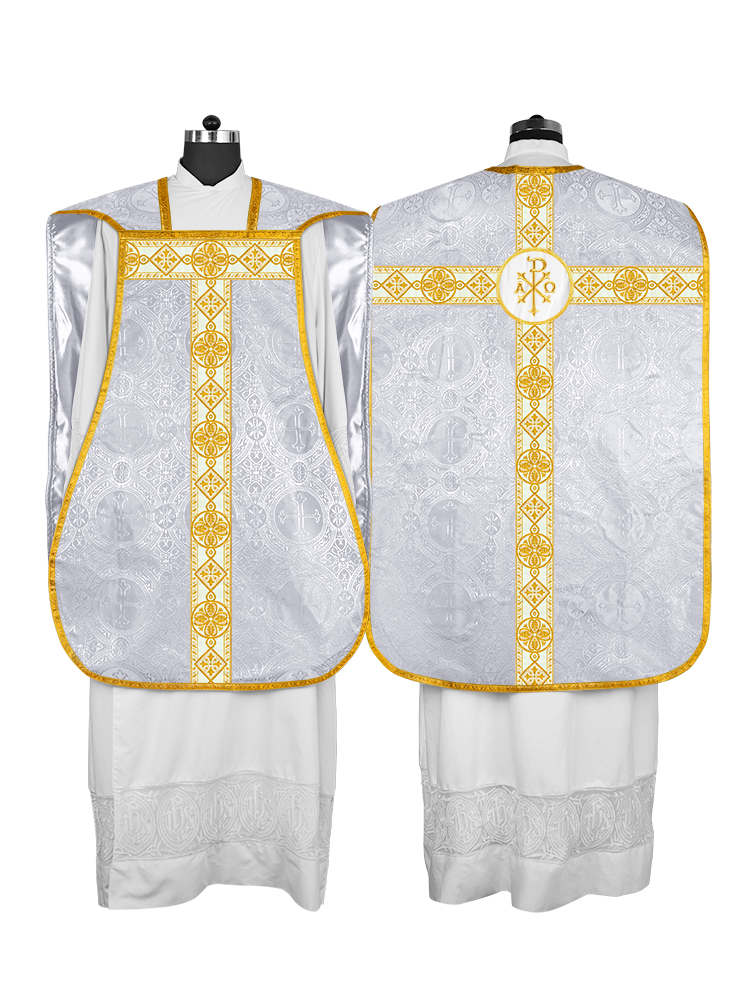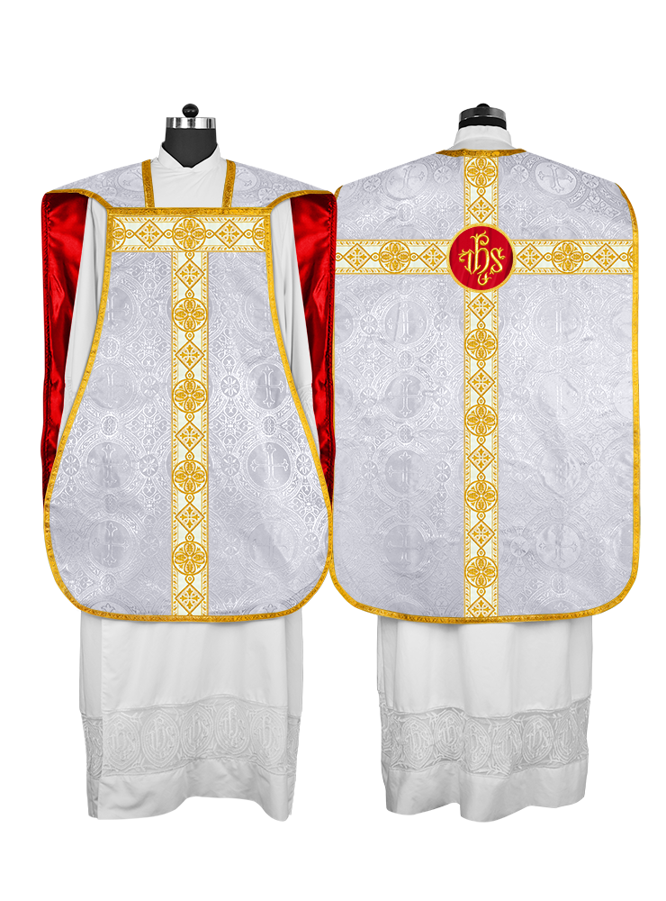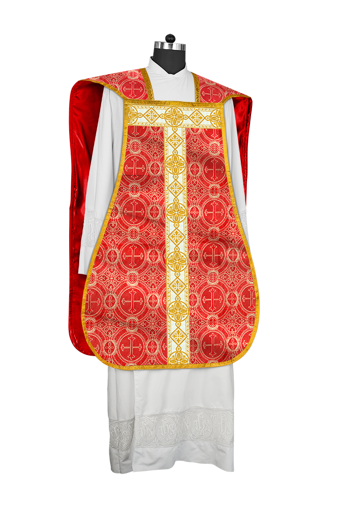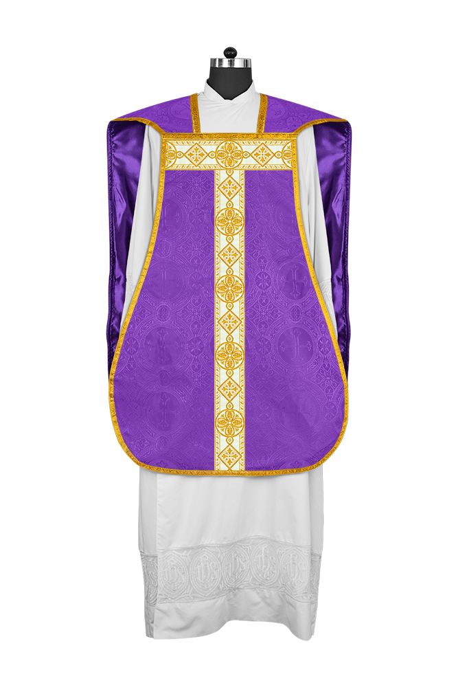 • La vestimenta de casulla romana / con respaldo de violín está hecha de orfebrería con motivos y diseños de bordados ornamentados.