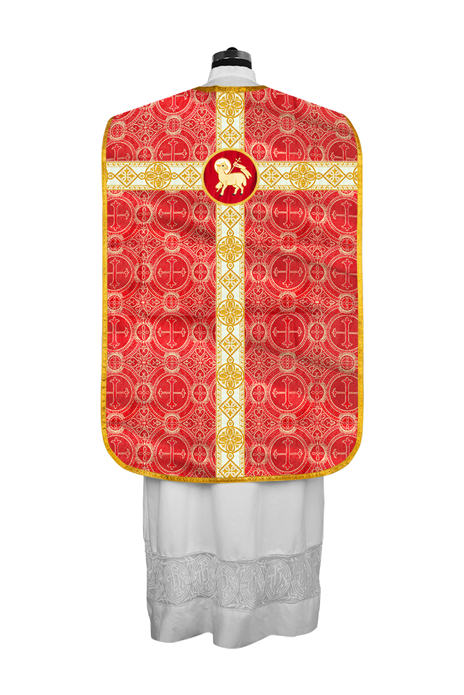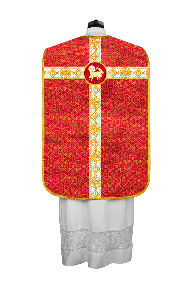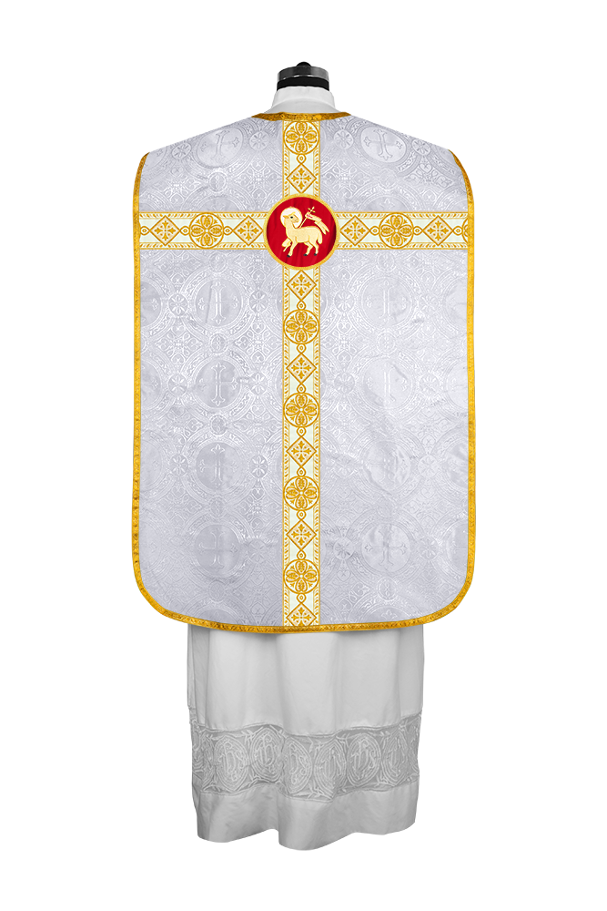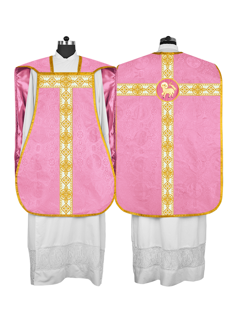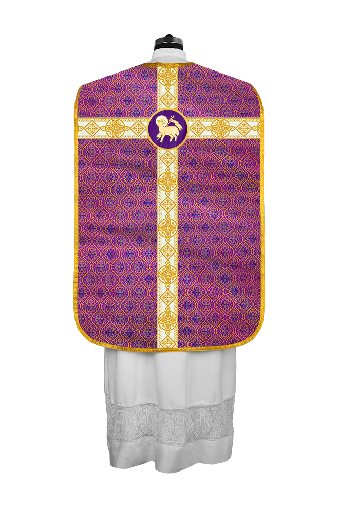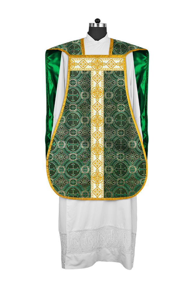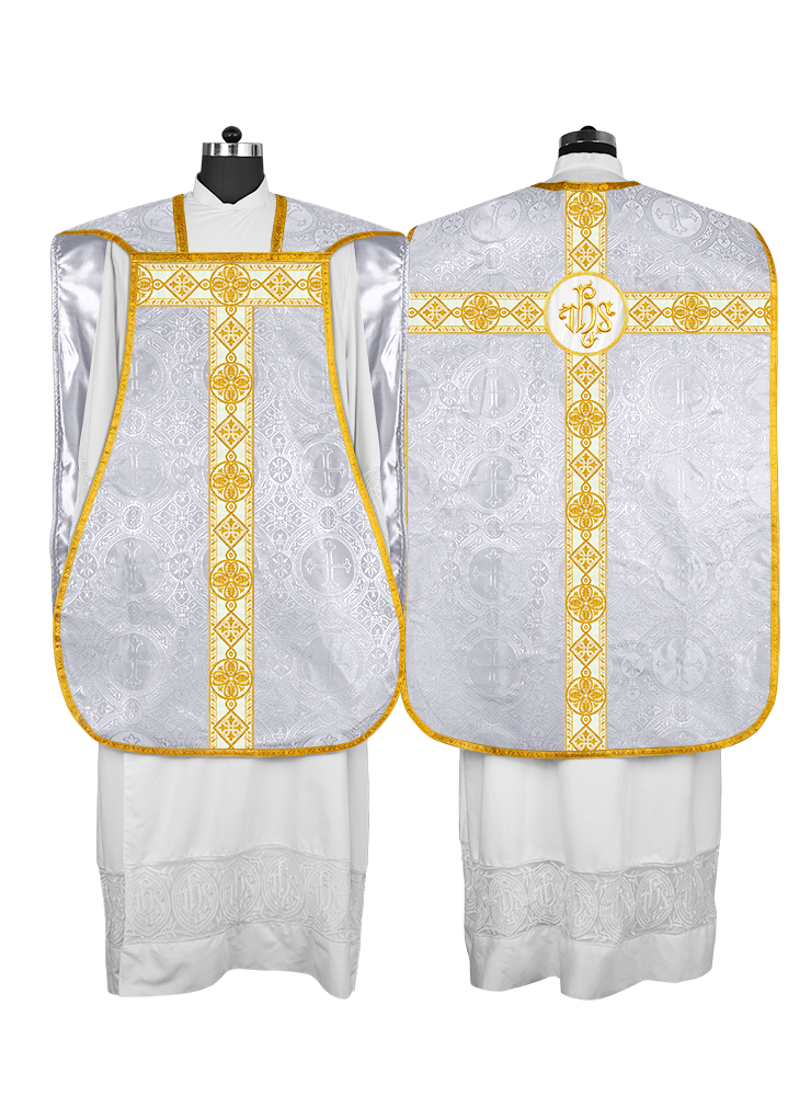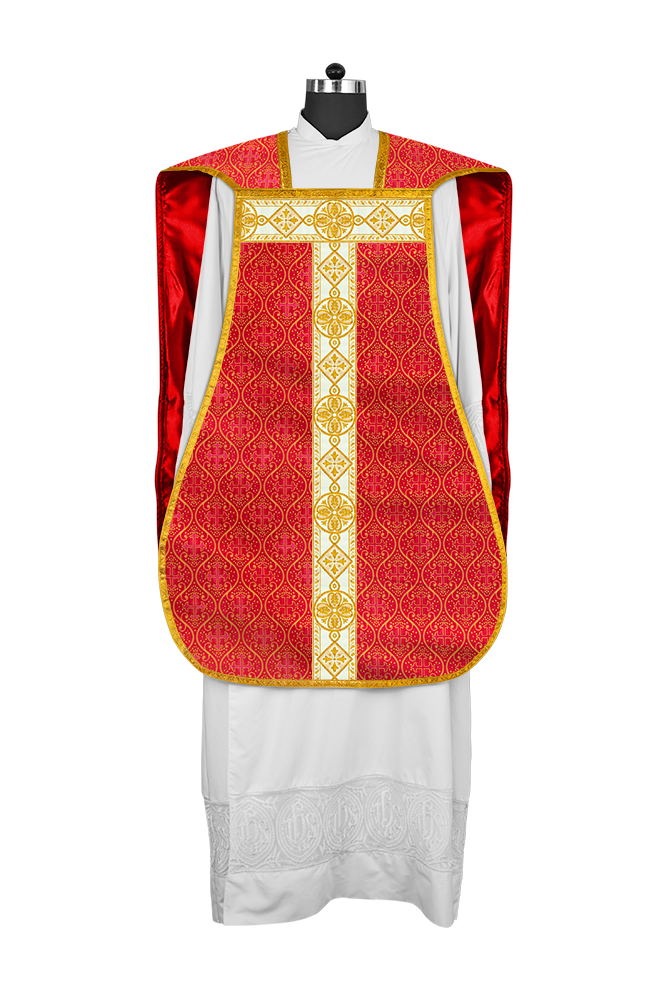 • La vestimenta de casulla romana / con respaldo de violín está hecha de orfebrería con motivos y diseños de bordados ornamentados.