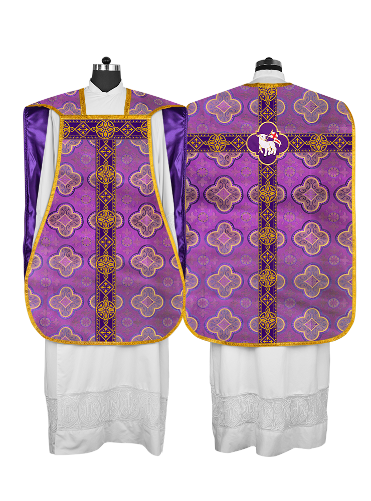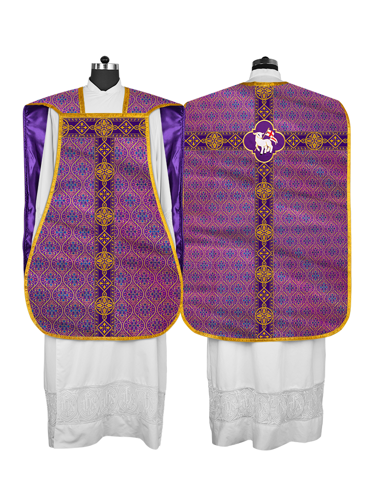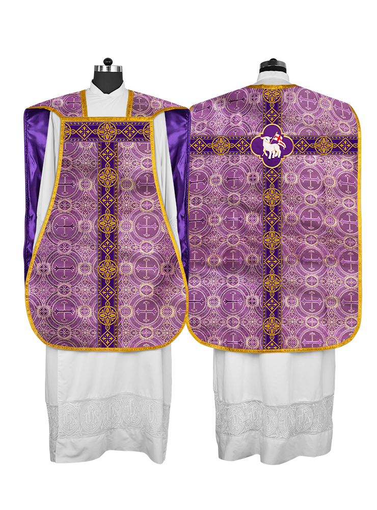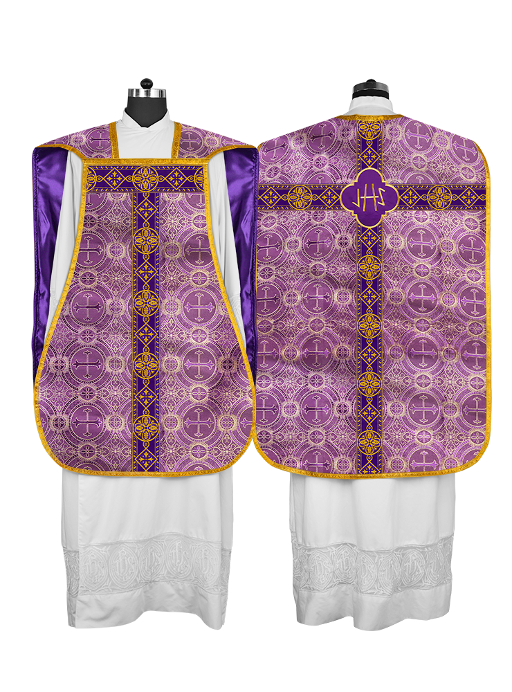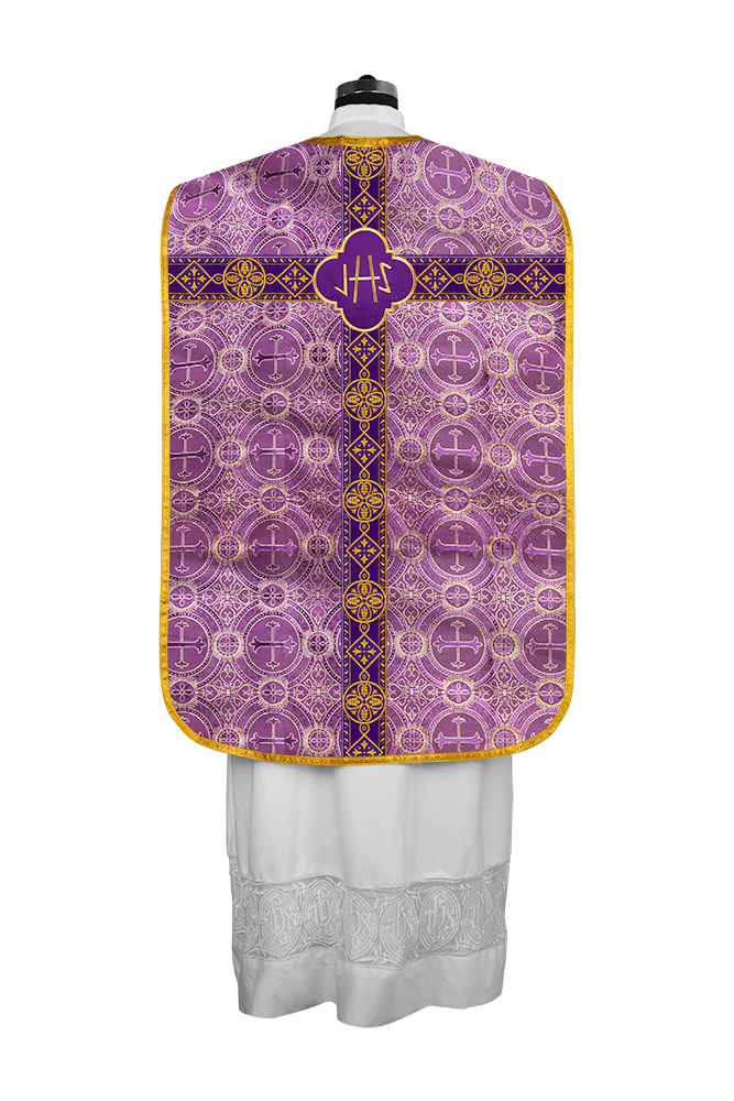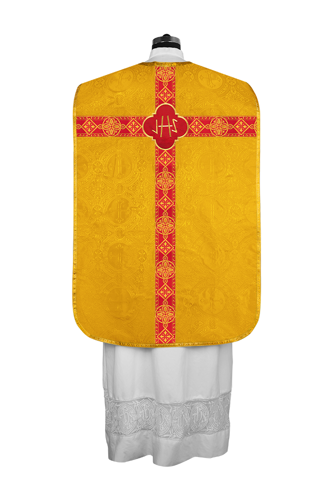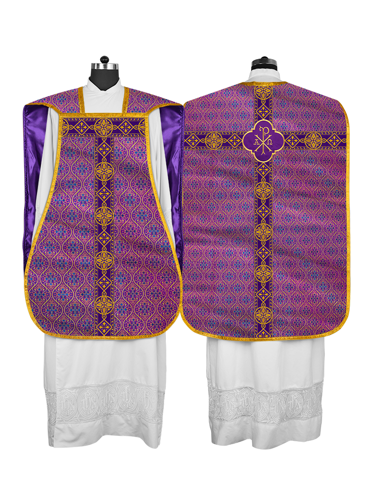 • La vestidura de casulla romana con espalda de violín está adornada con un motivo bordado.