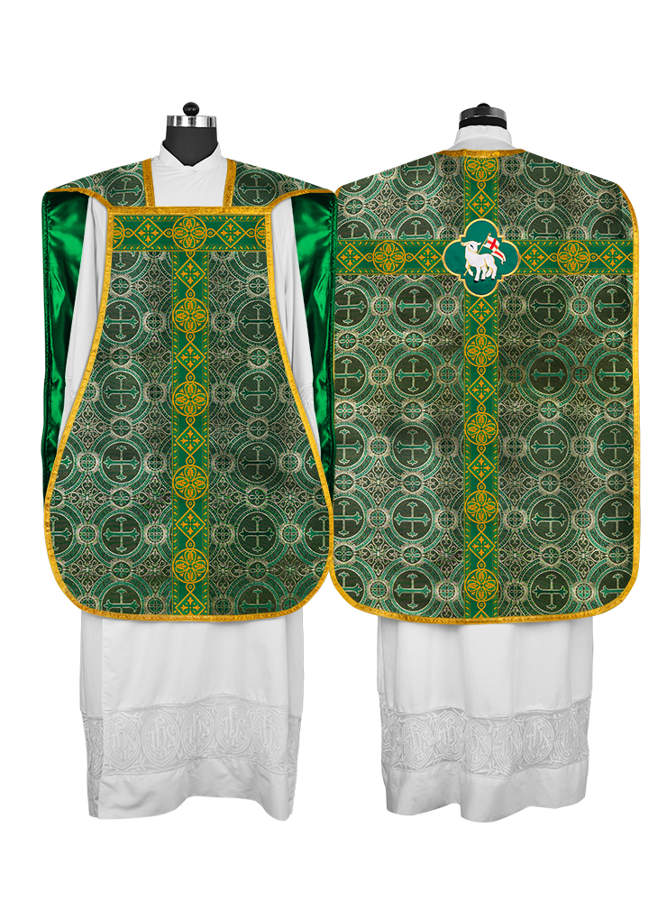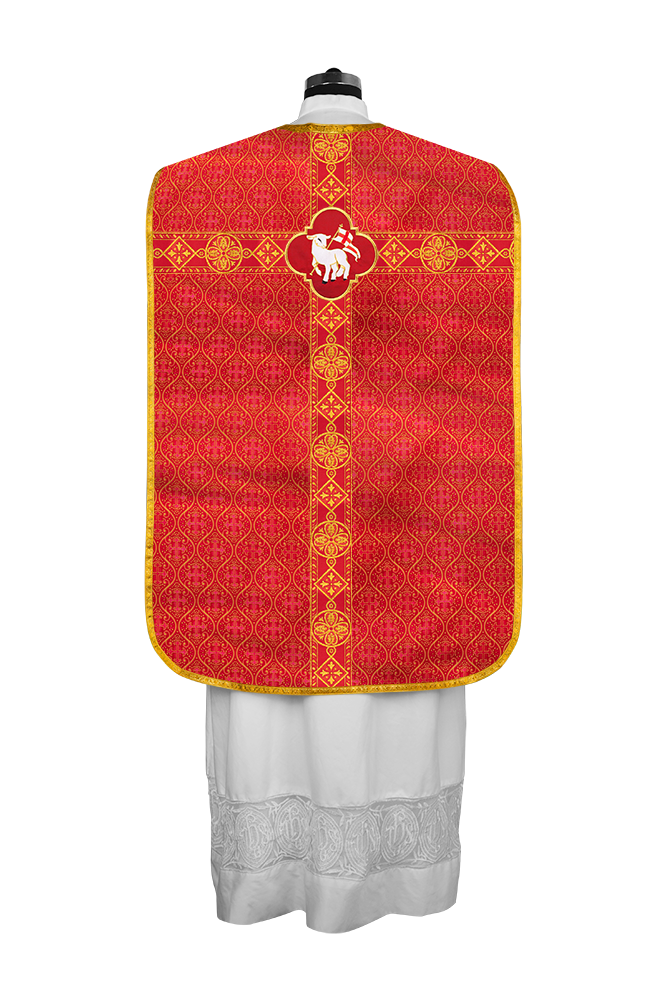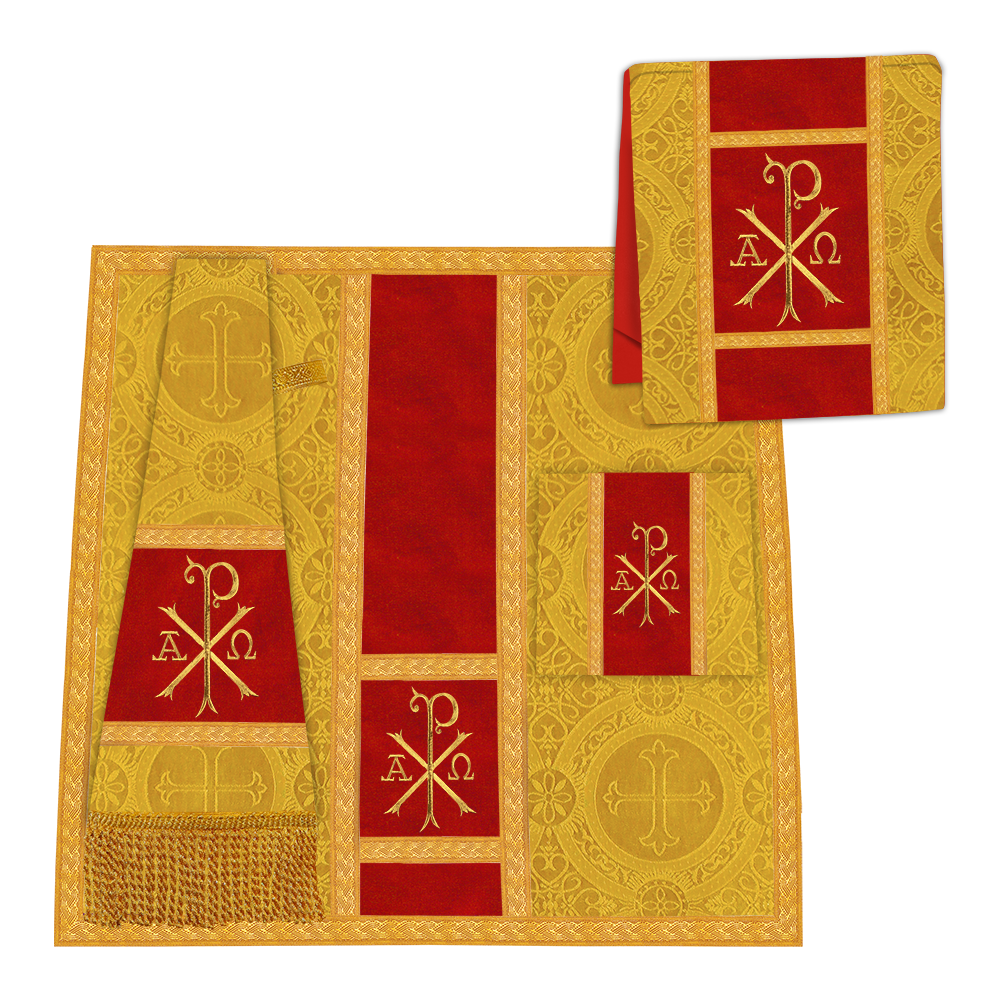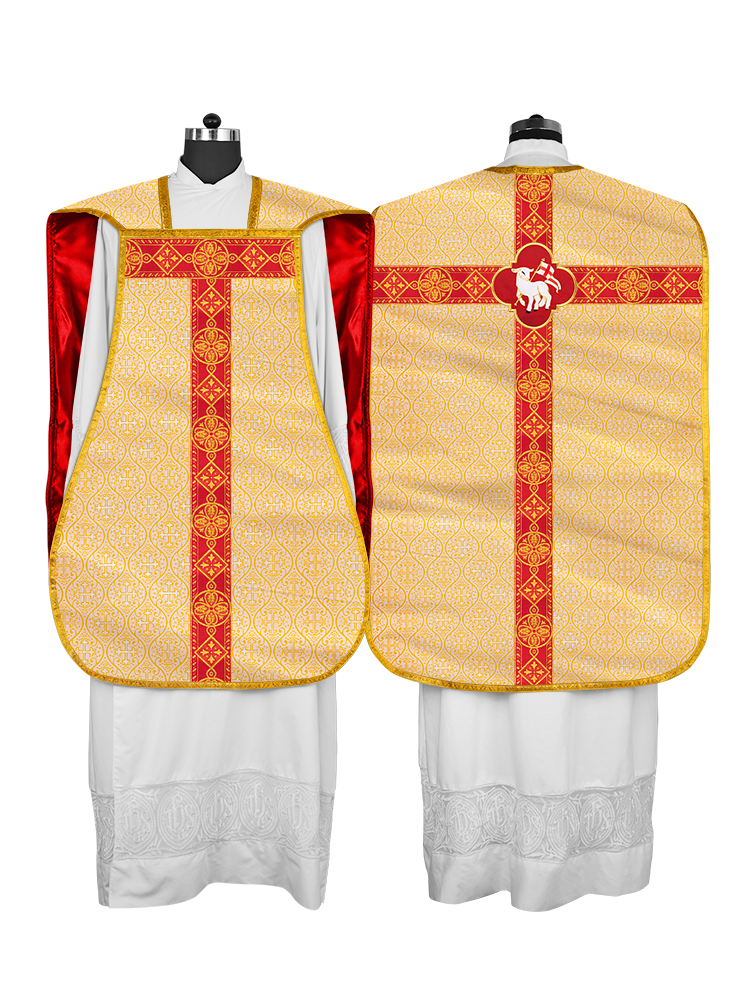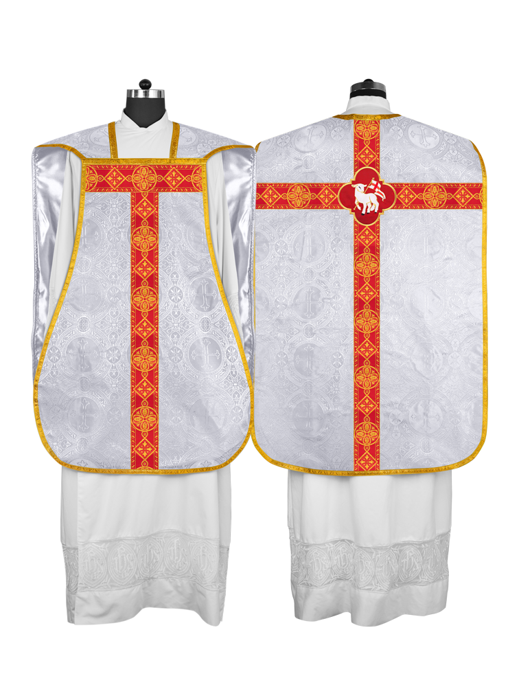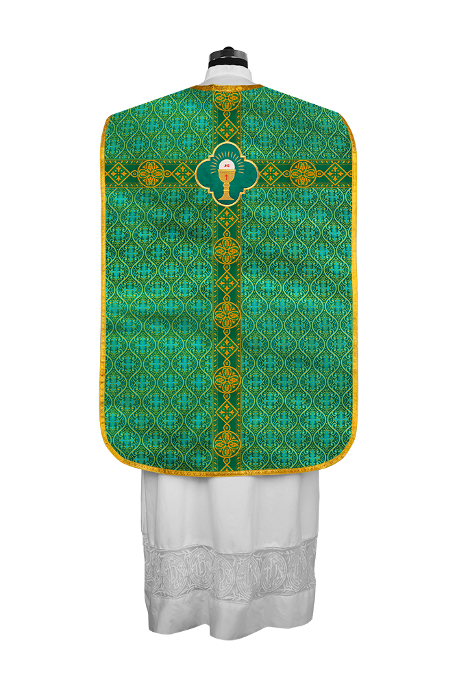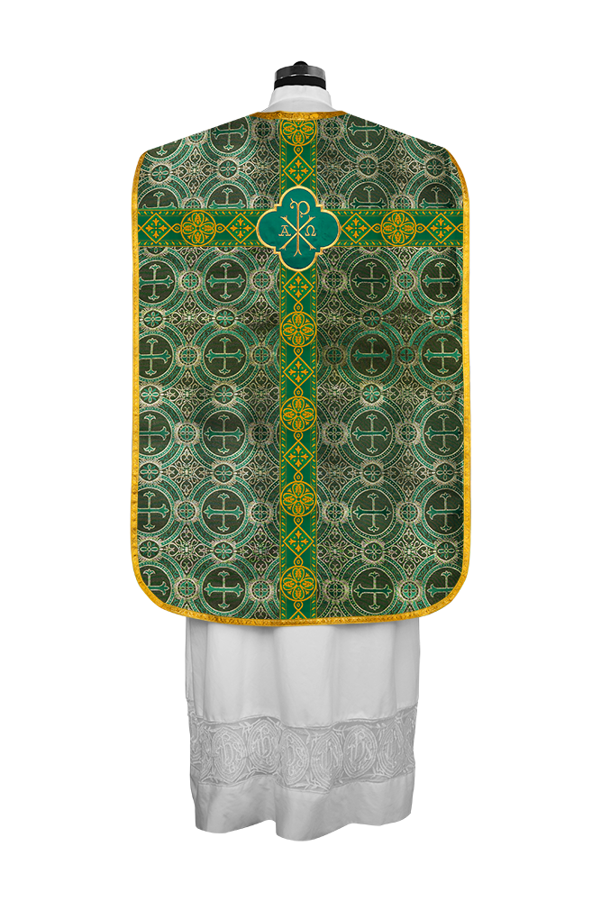 • La vestidura de casulla romana con espalda de violín está adornada con un motivo bordado.