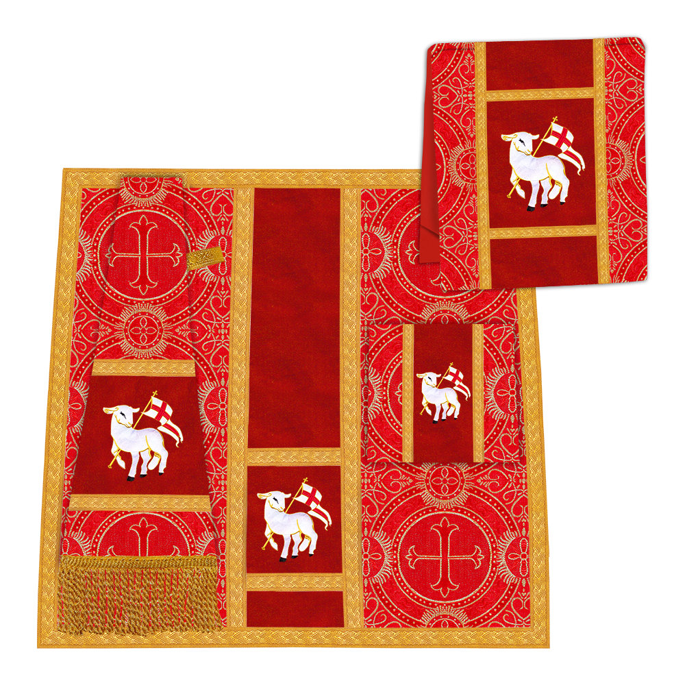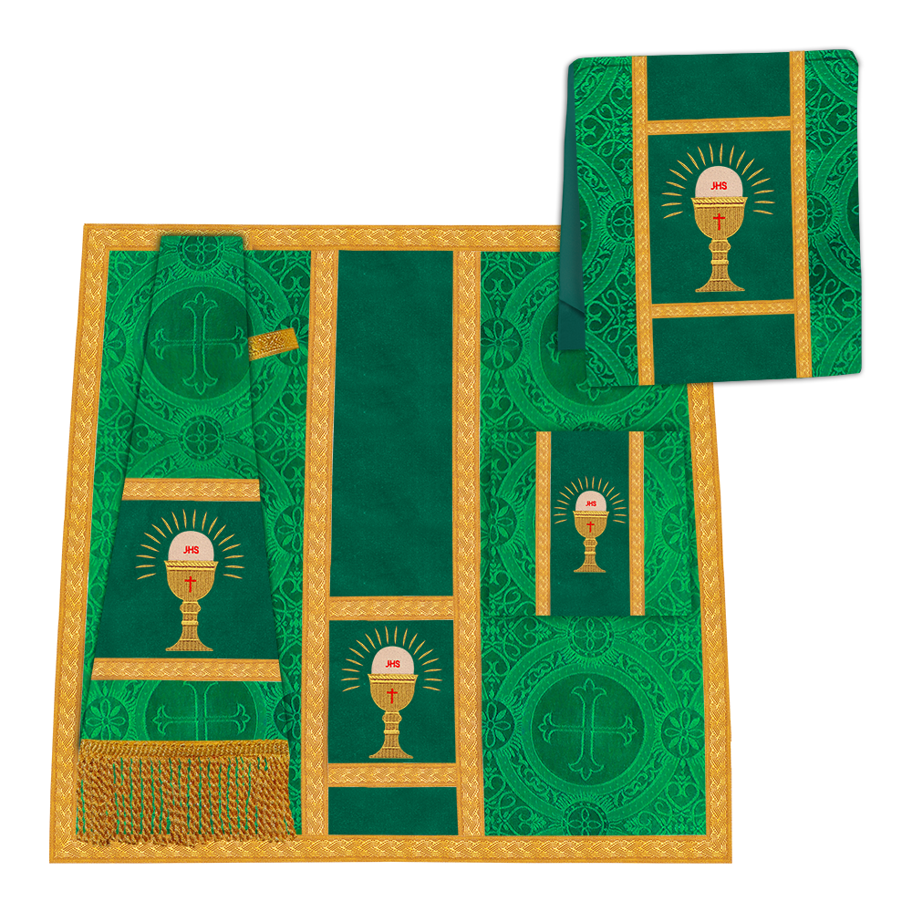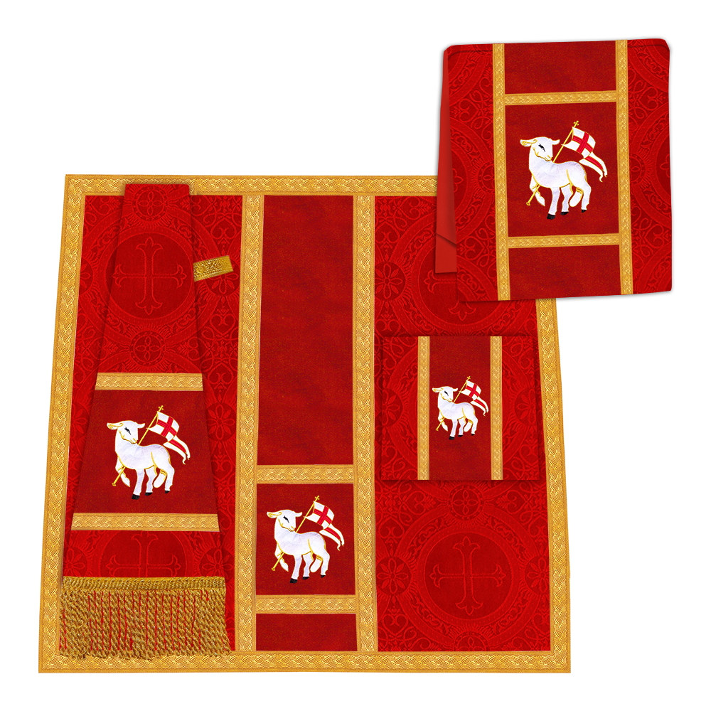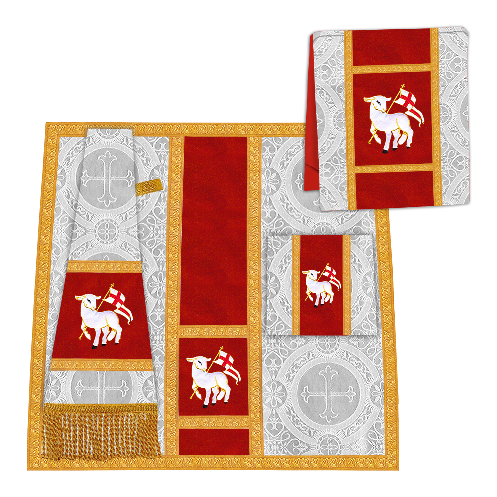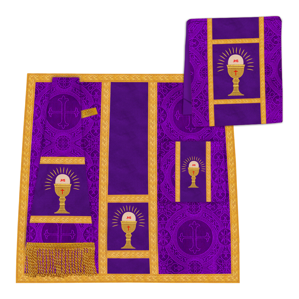 • La vestidura de casulla romana con espalda de violín está adornada con un motivo bordado.