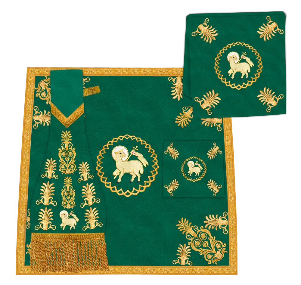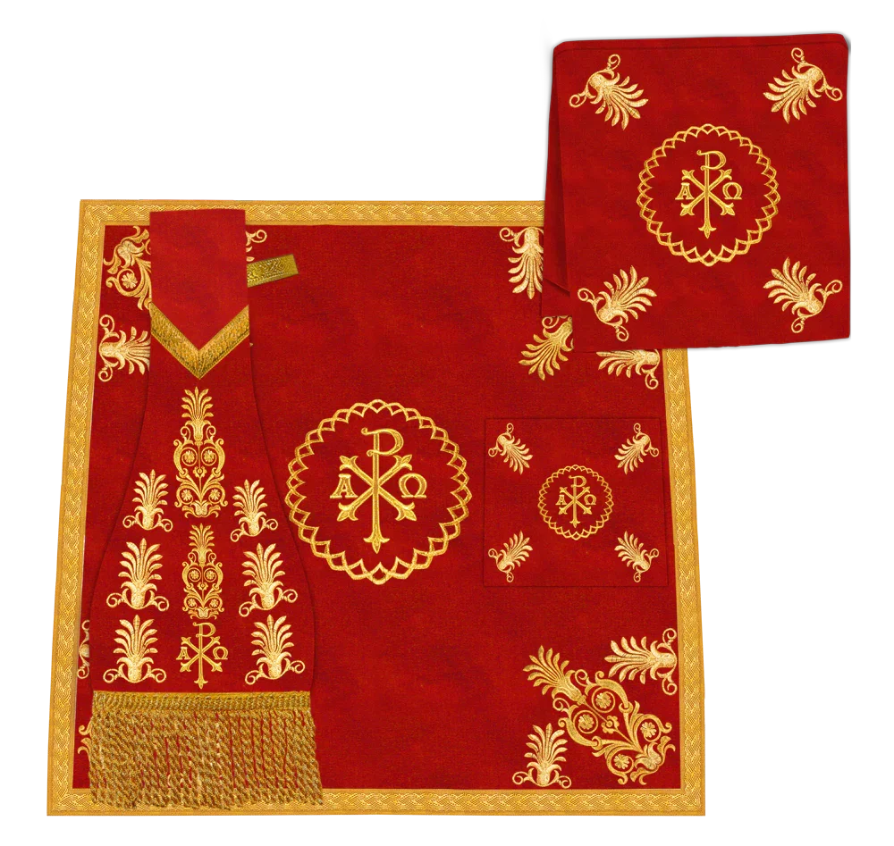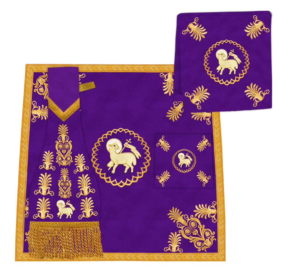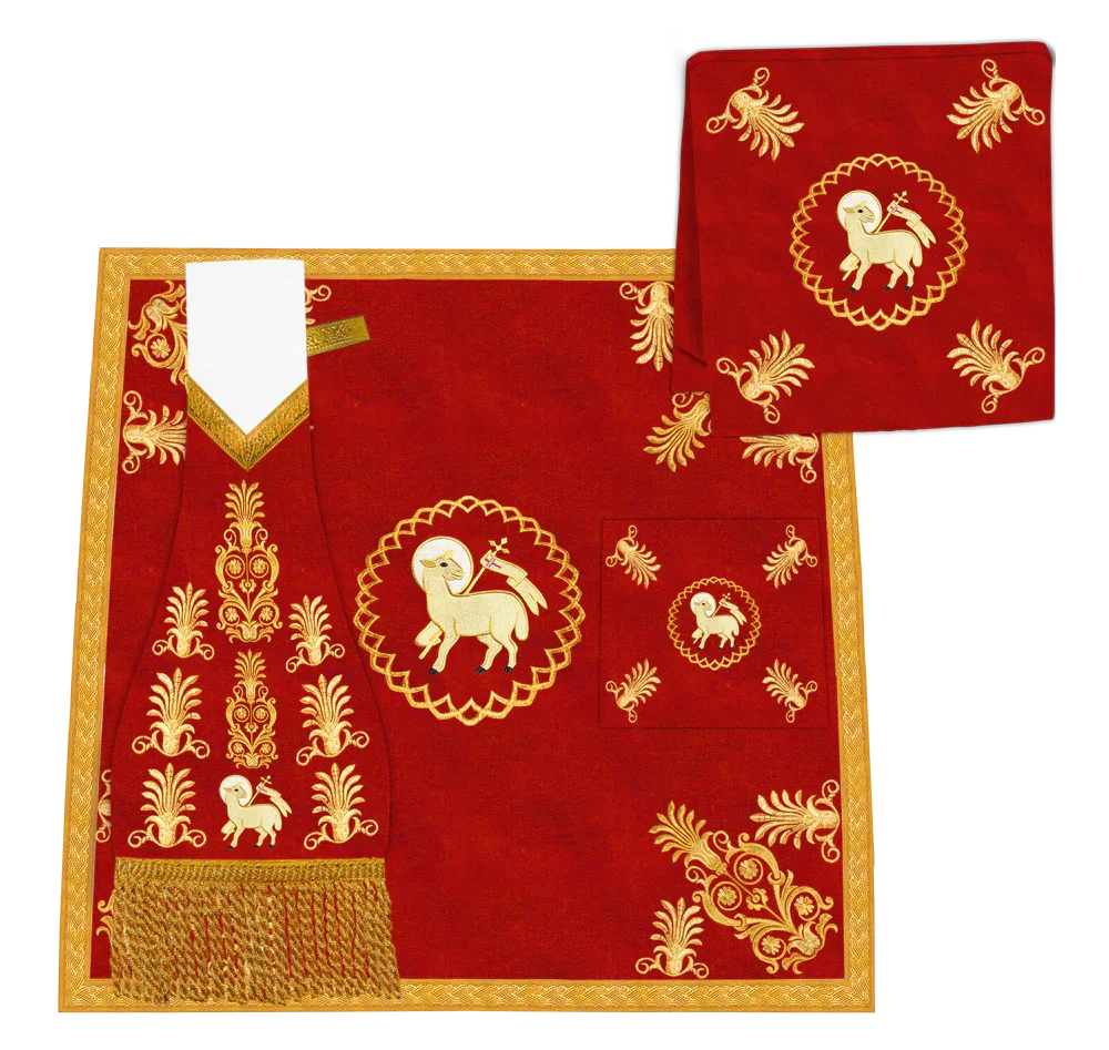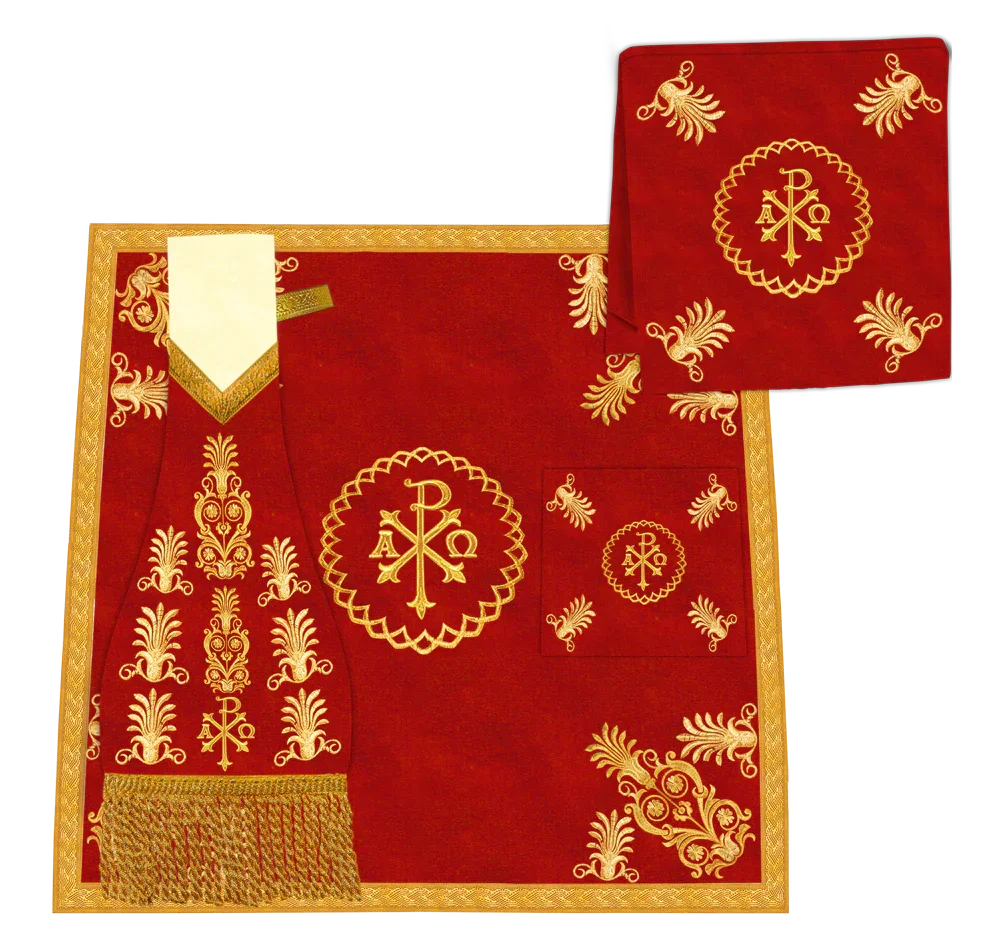 • Optional Matching Mass Set ($42): Includes Chalice Veil (20" x 20"), Burse (10" x 9"), Maniple(19"), and Chalice Pall (8" x 8") for a complete ceremonial set.