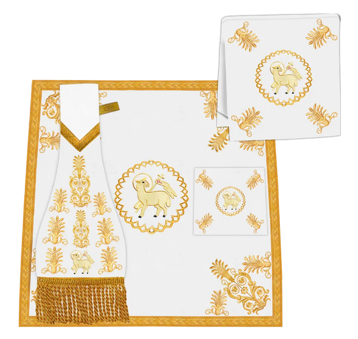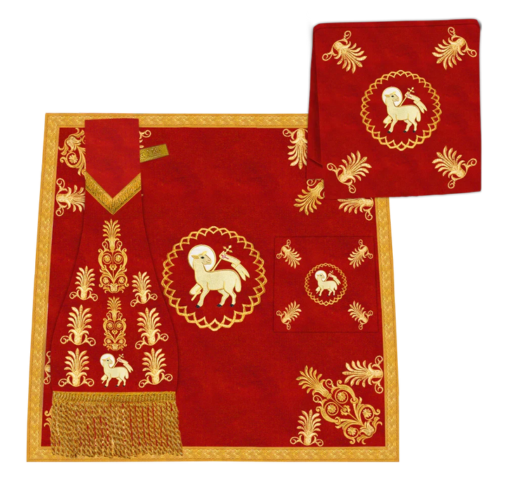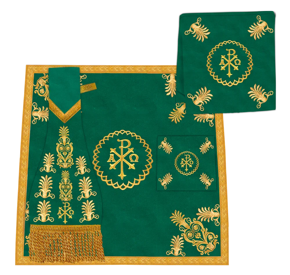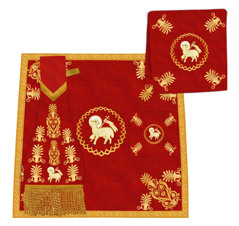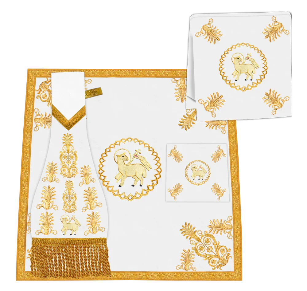 • Optional Matching Mass Set ($42): Includes Chalice Veil (20" x 20"), Burse (10" x 9"), Maniple(19"), and Chalice Pall (8" x 8") for a complete ceremonial set.