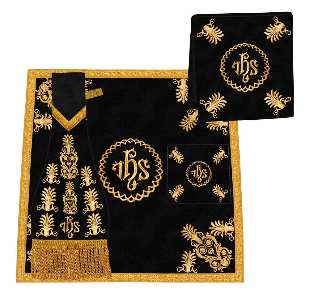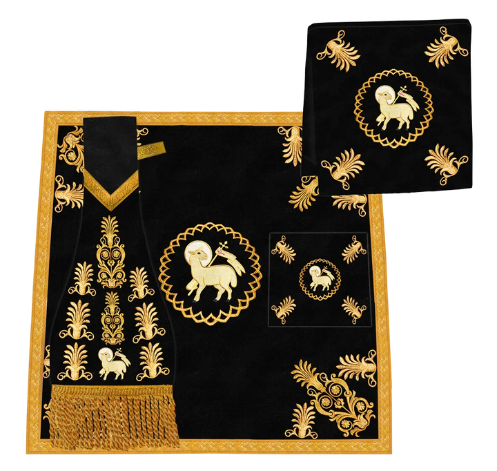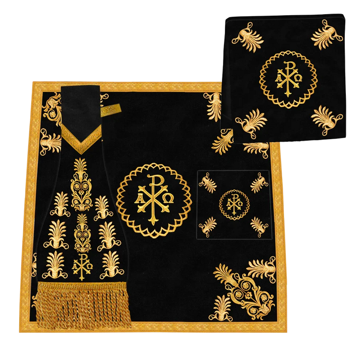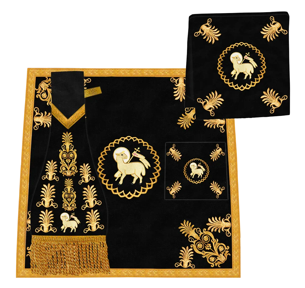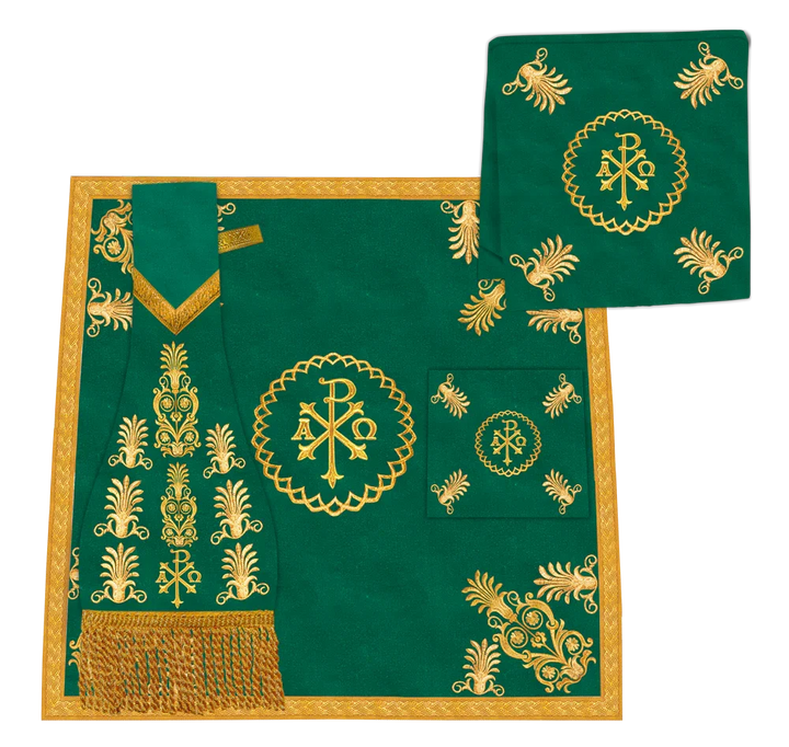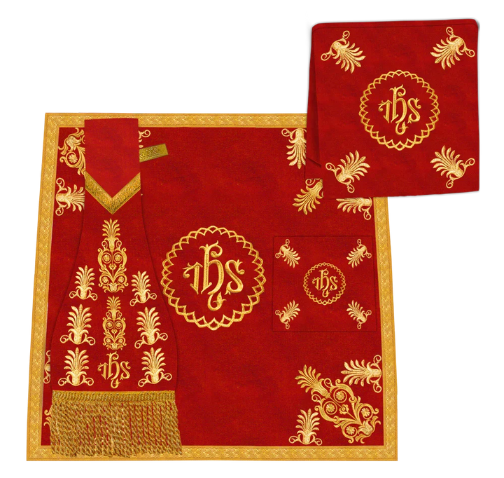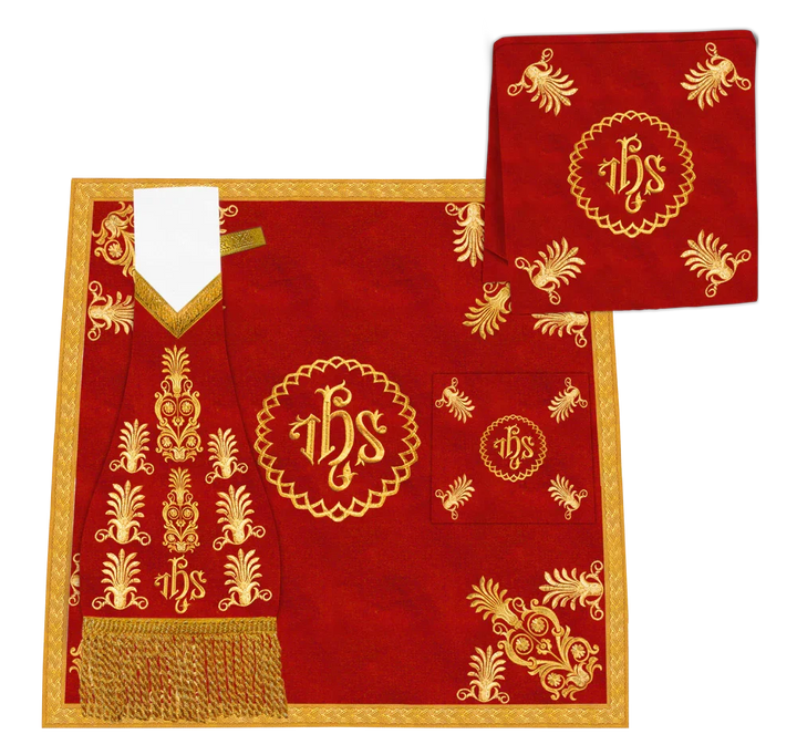 • Optional Matching Mass Set ($42): Includes Chalice Veil (20" x 20"), Burse (10" x 9"), Maniple(19"), and Chalice Pall (8" x 8") for a complete ceremonial set.