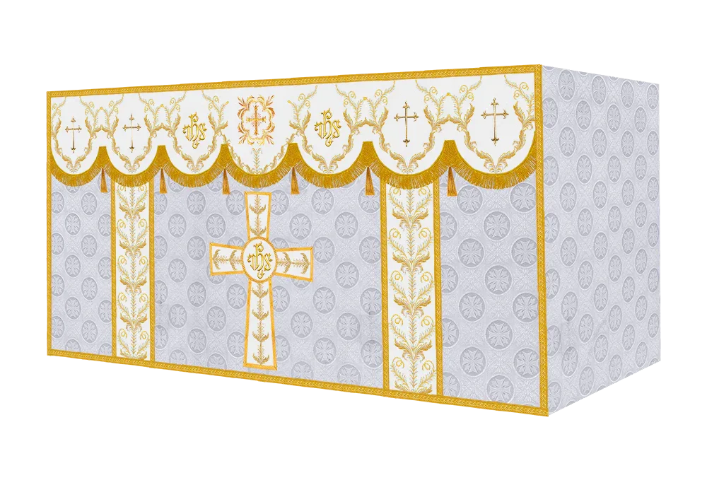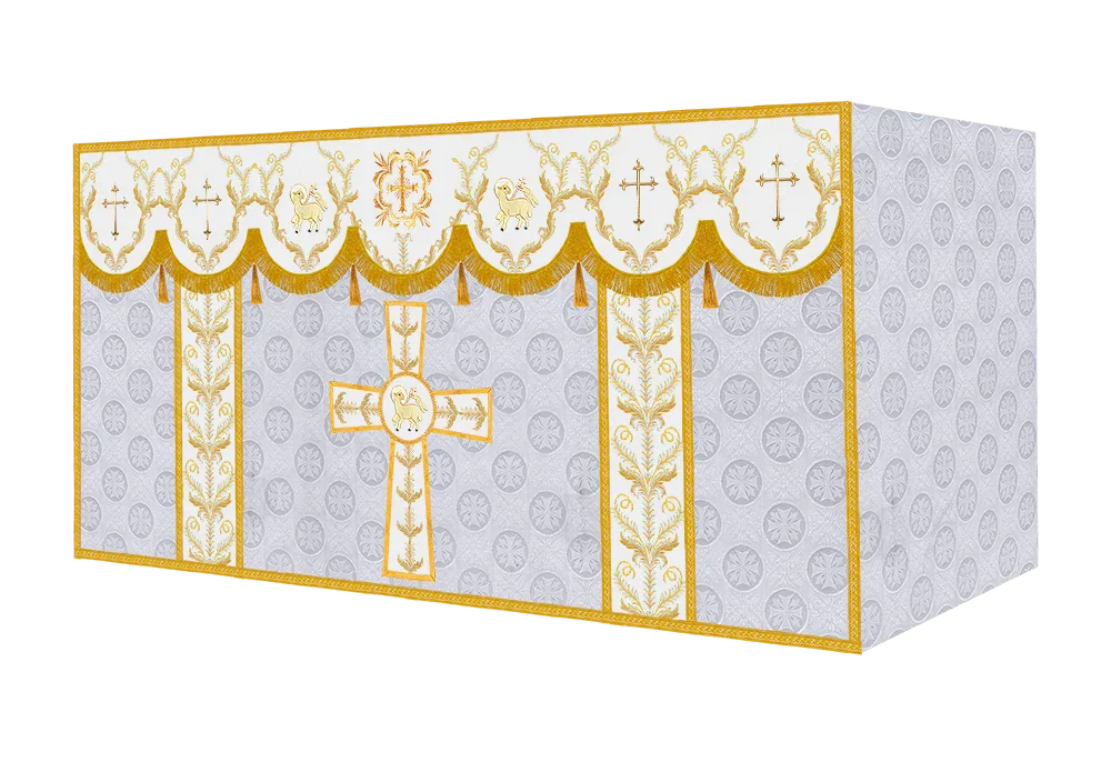 The Liturgical Altar Cloth with Elegant Embroidery Trims blends craftsmanship, luxury, and spiritual significance.Β Its intricate embroidery and refined trims create a dignified centerpiece. The structured satin drop adds elegance to any sanctuary.Β Ideal for congregations that value quality, heritage, and reverence.Β This altar cloth enhances every liturgical celebration.Β It remains a treasured part of your church’s sacred seasons.
