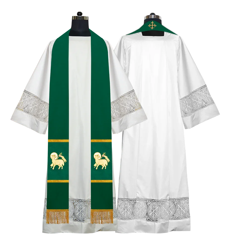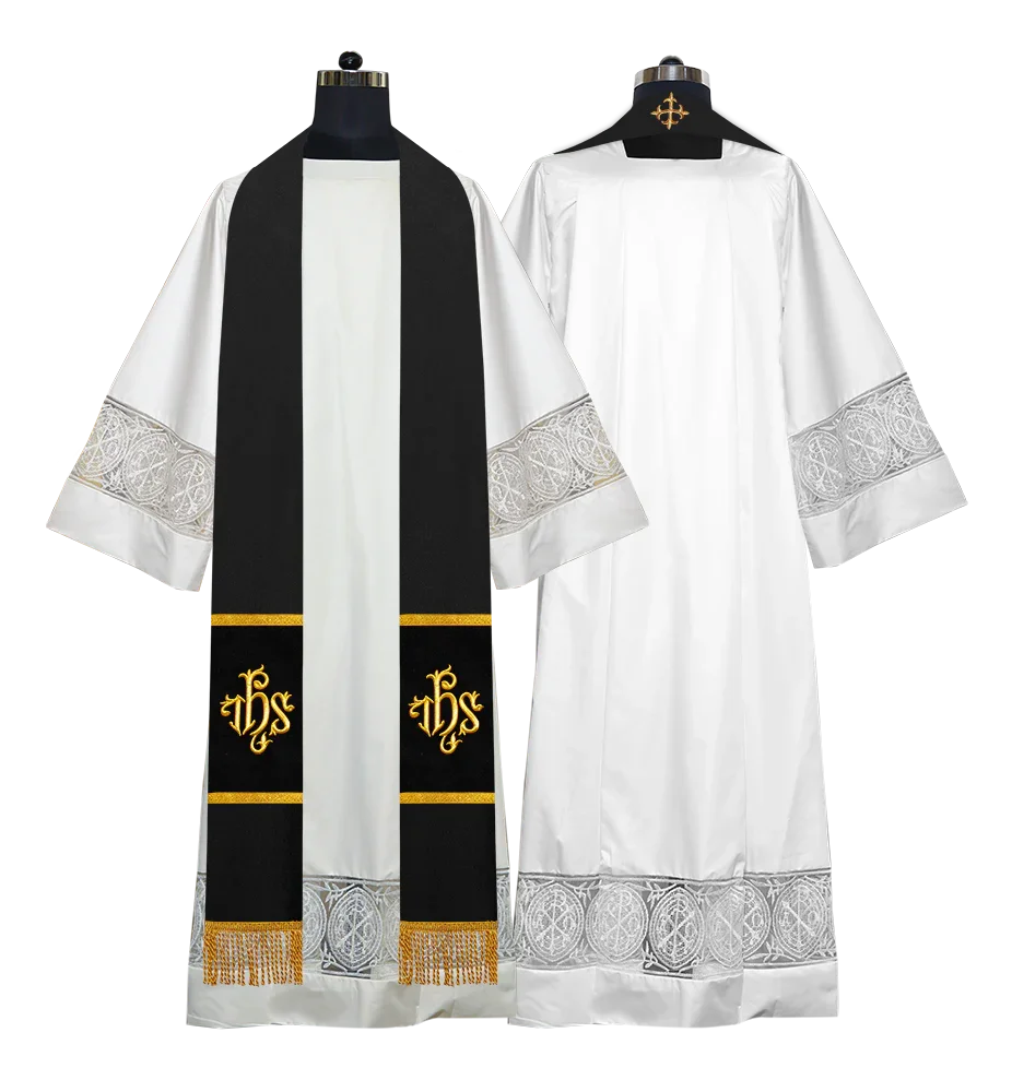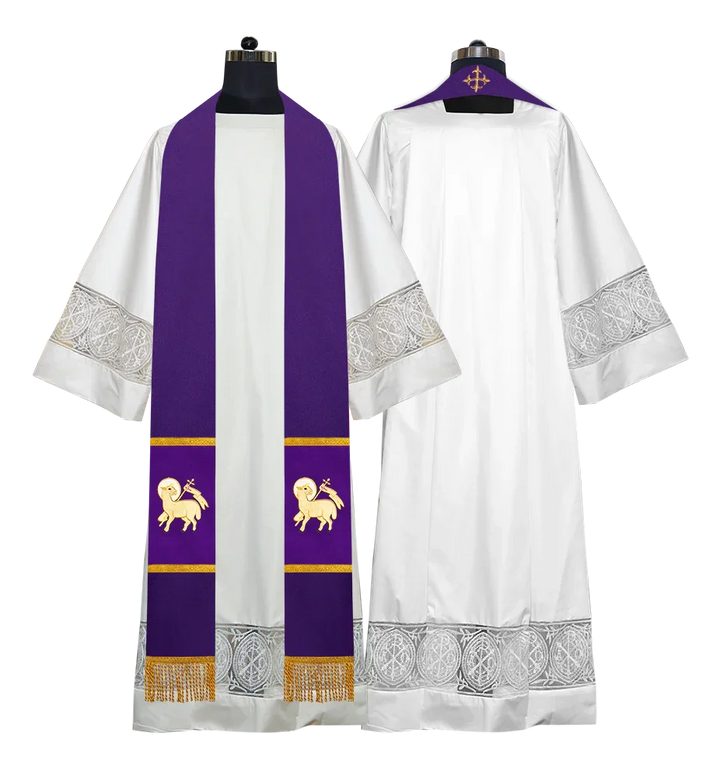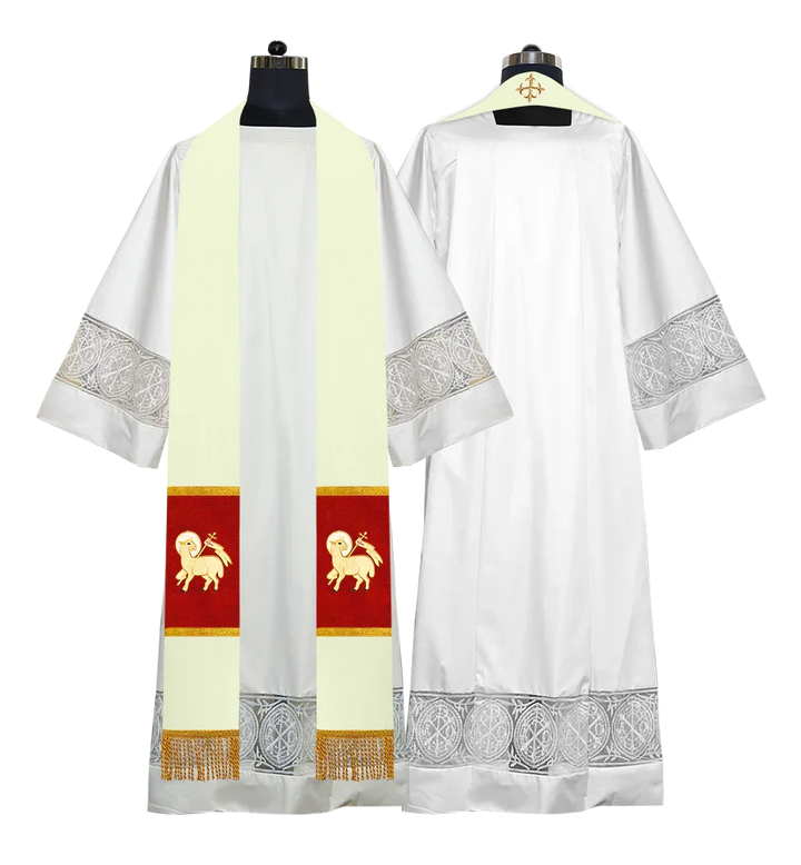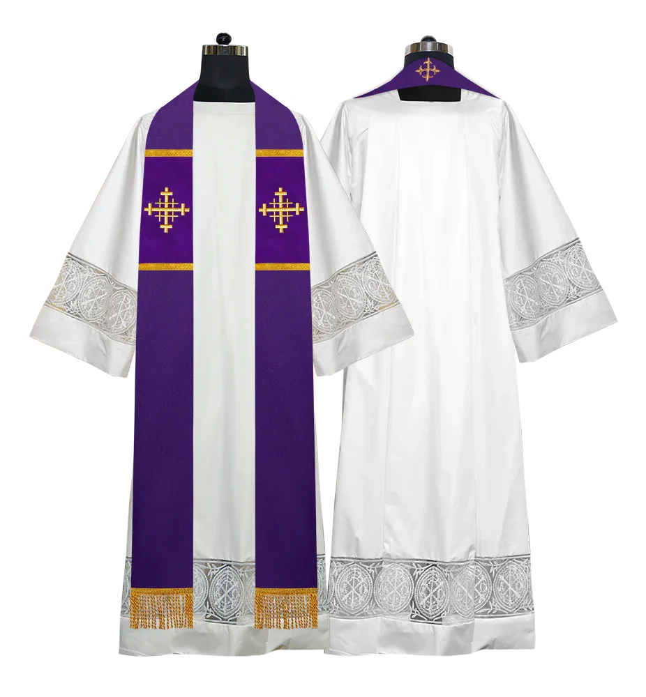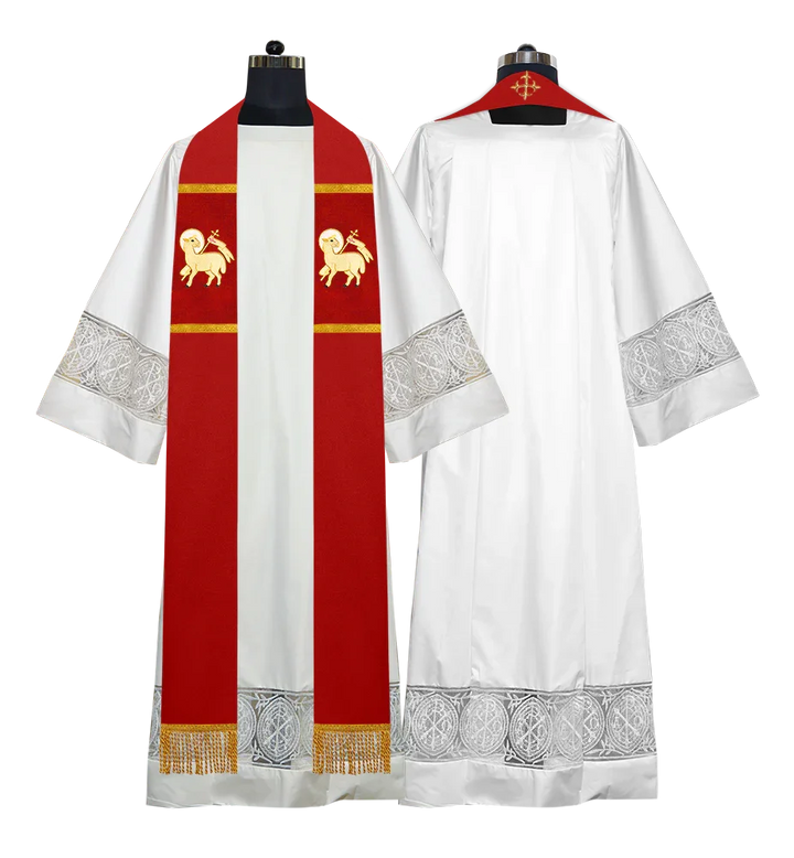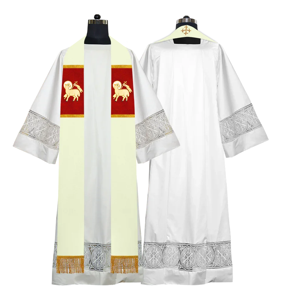 • Each stole features embroidered spiritual motifs, allowing selection from IHS, PAX, Agnus Dei, Jerusalem Cross, or Western Cross designs.