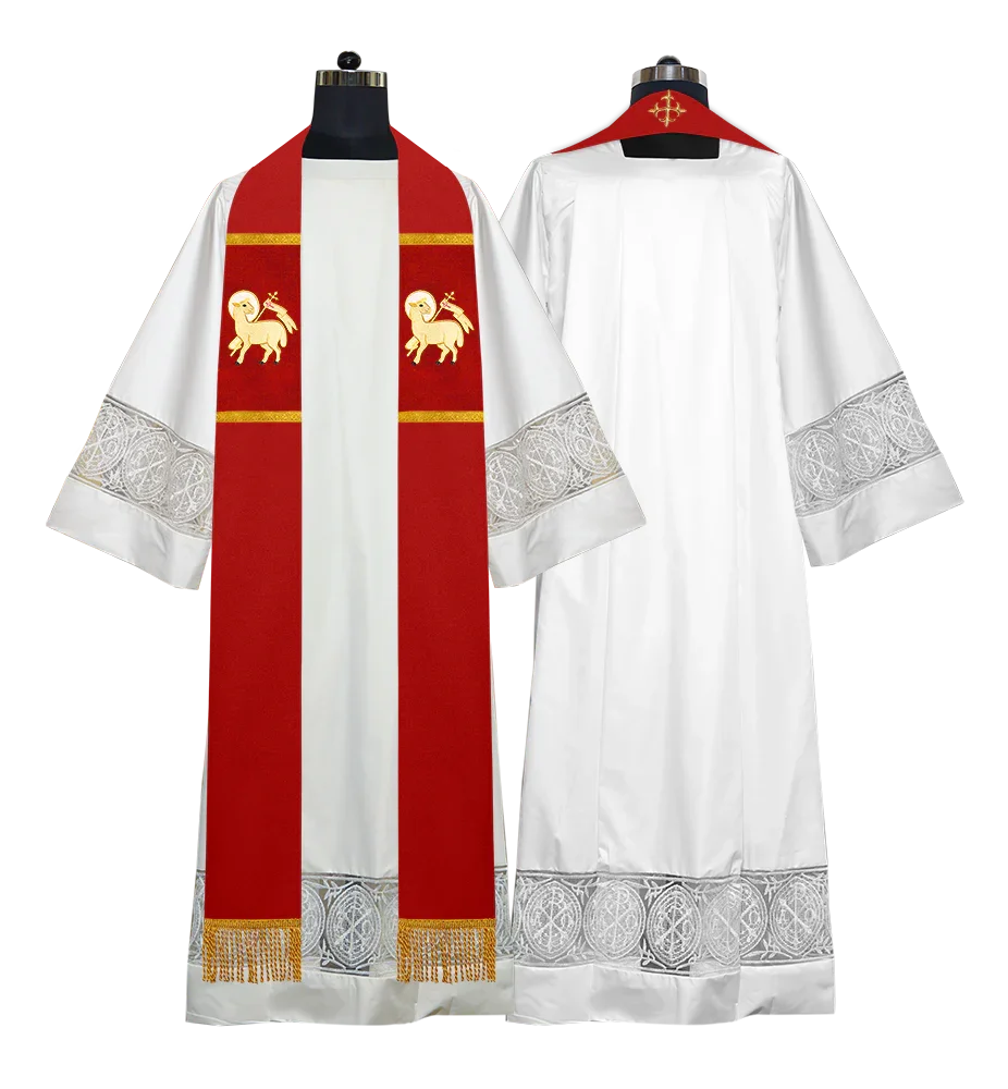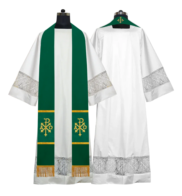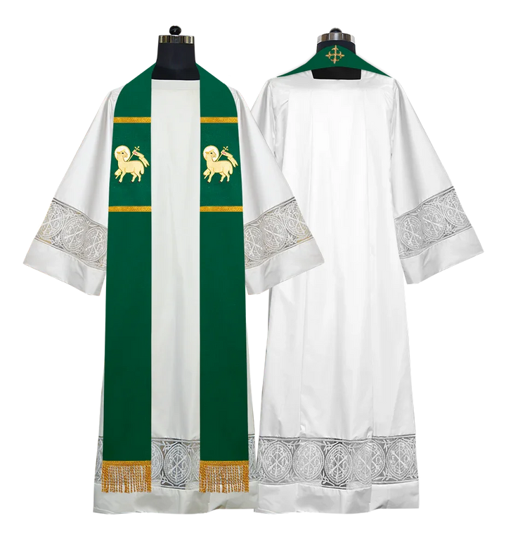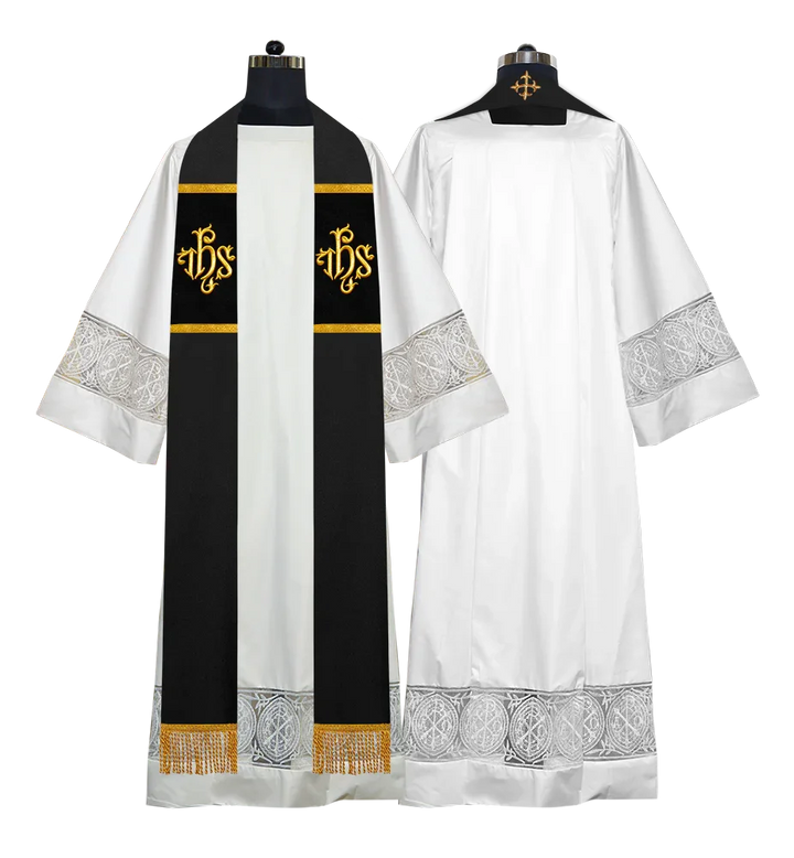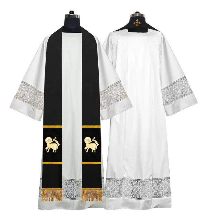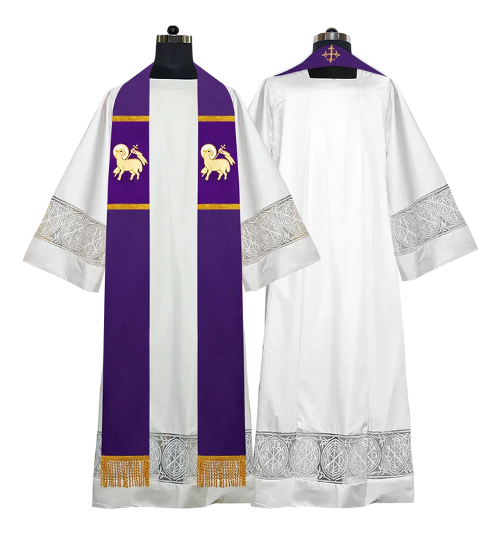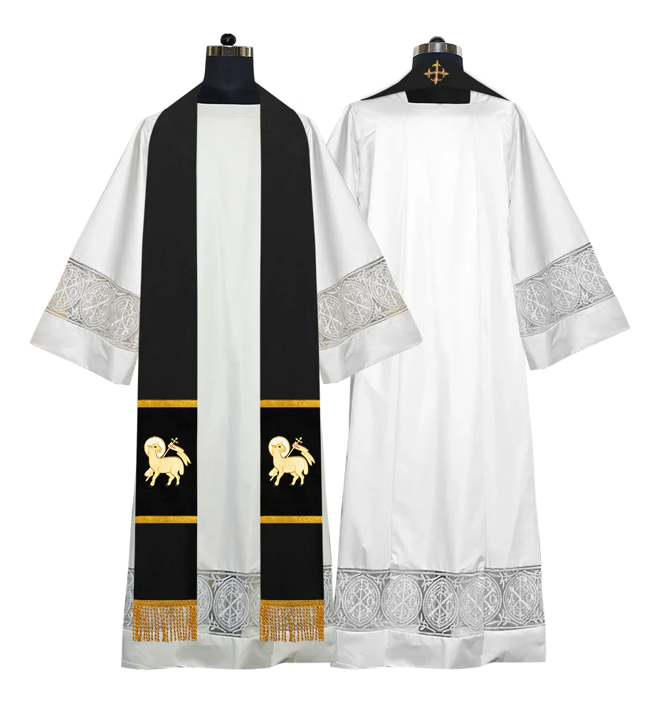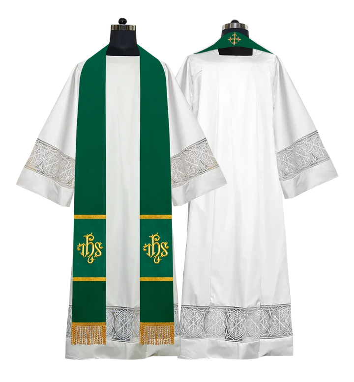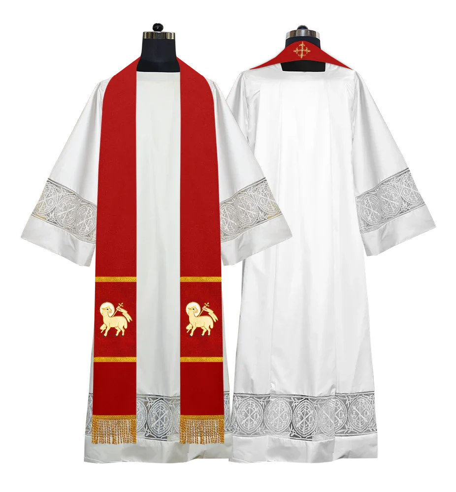 • Each stole features embroidered spiritual motifs, allowing selection from IHS, PAX, Agnus Dei, Jerusalem Cross, or Western Cross designs.