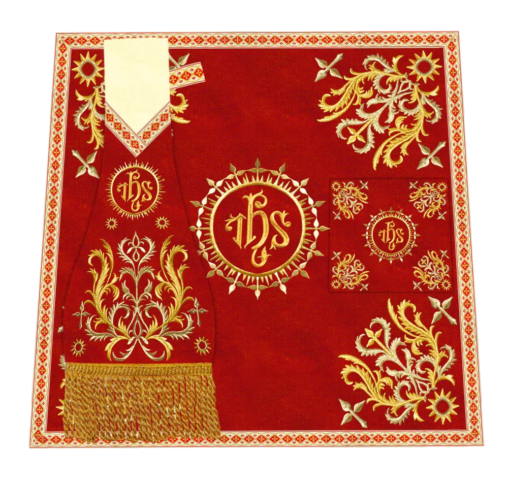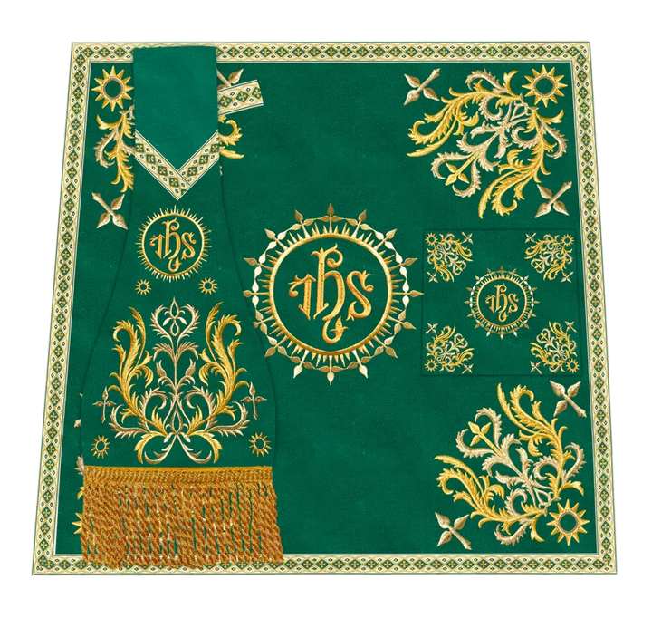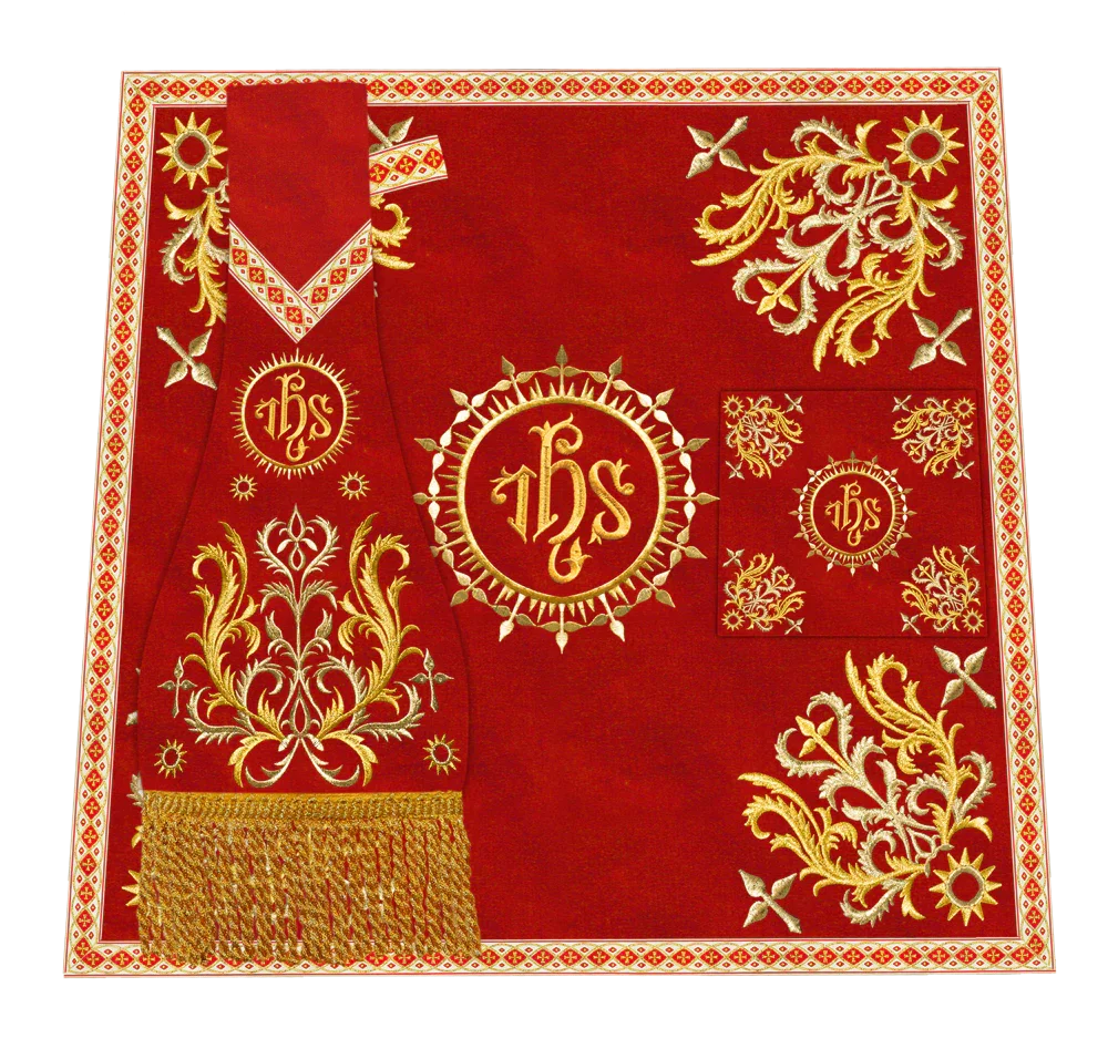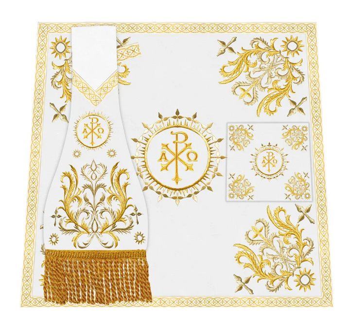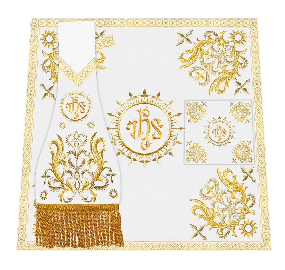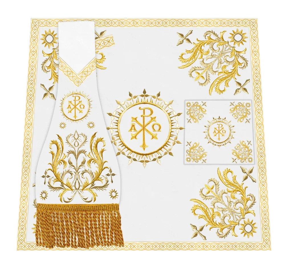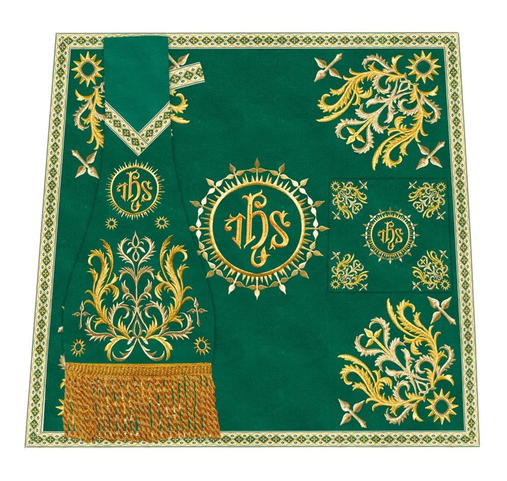 Elevate every celebration of the Eucharist with the Embroidered Mass Set. It is meticulously crafted for clergy who value reverence, tradition, and exceptional craftsmanship. Made from premium Taffeta fabric, each piece offers a luxurious texture and subtle sheen. The set provides enduring quality and enhances the solemnity of every liturgical ceremony.